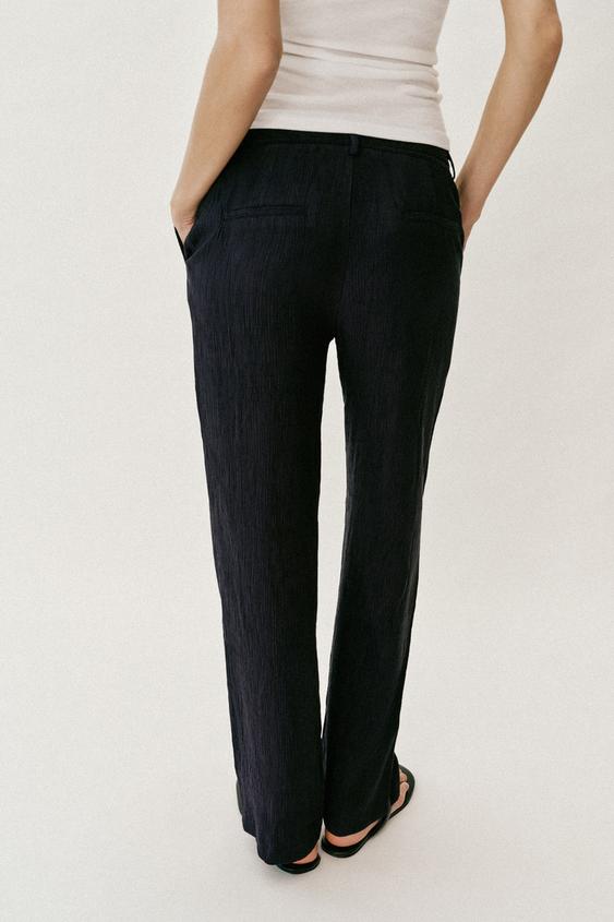 Брюки со средней посадкой, передними карманами и задними прорезными карманами. Прямые штанины. Застежка-молния и пуговица. Ткань с эффектом жатки.