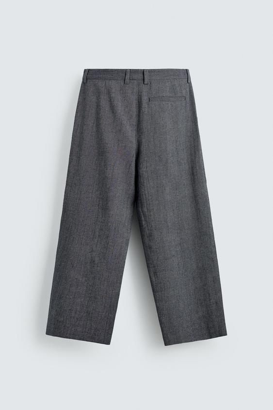 Брюки свободного кроя из ткани с содержанием 15% льна. Пояс с двойными складками спереди. Передние карманы и задние прорезные карманы. Застежка-молния и пуговица.
