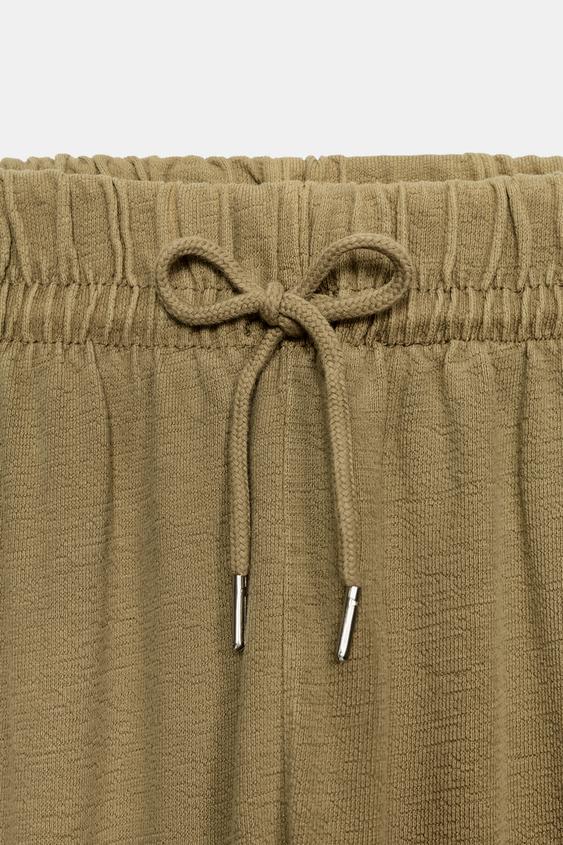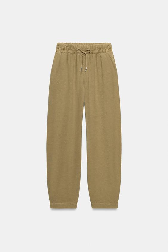 Брюки из хлопковой пряжи со средней посадкой и эластичным поясом, регулируемым шнурками. Скрытые боковые карманы в швах. Эффект потертости.