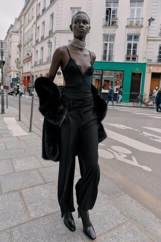 Брюки с высокой посадкой и передними карманами на молнии. Широкие штанины. Застежка-молния, внутренняя пуговица и потайные крючки.