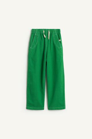 Брюки из смеси 79% хлопка и 21% льна. Контрастная цветная строчка с деталями, спереди с цанговыми застежками, сзади с накладными карманами, передними карманами, резинкой на талии и регулируемым шнурком.