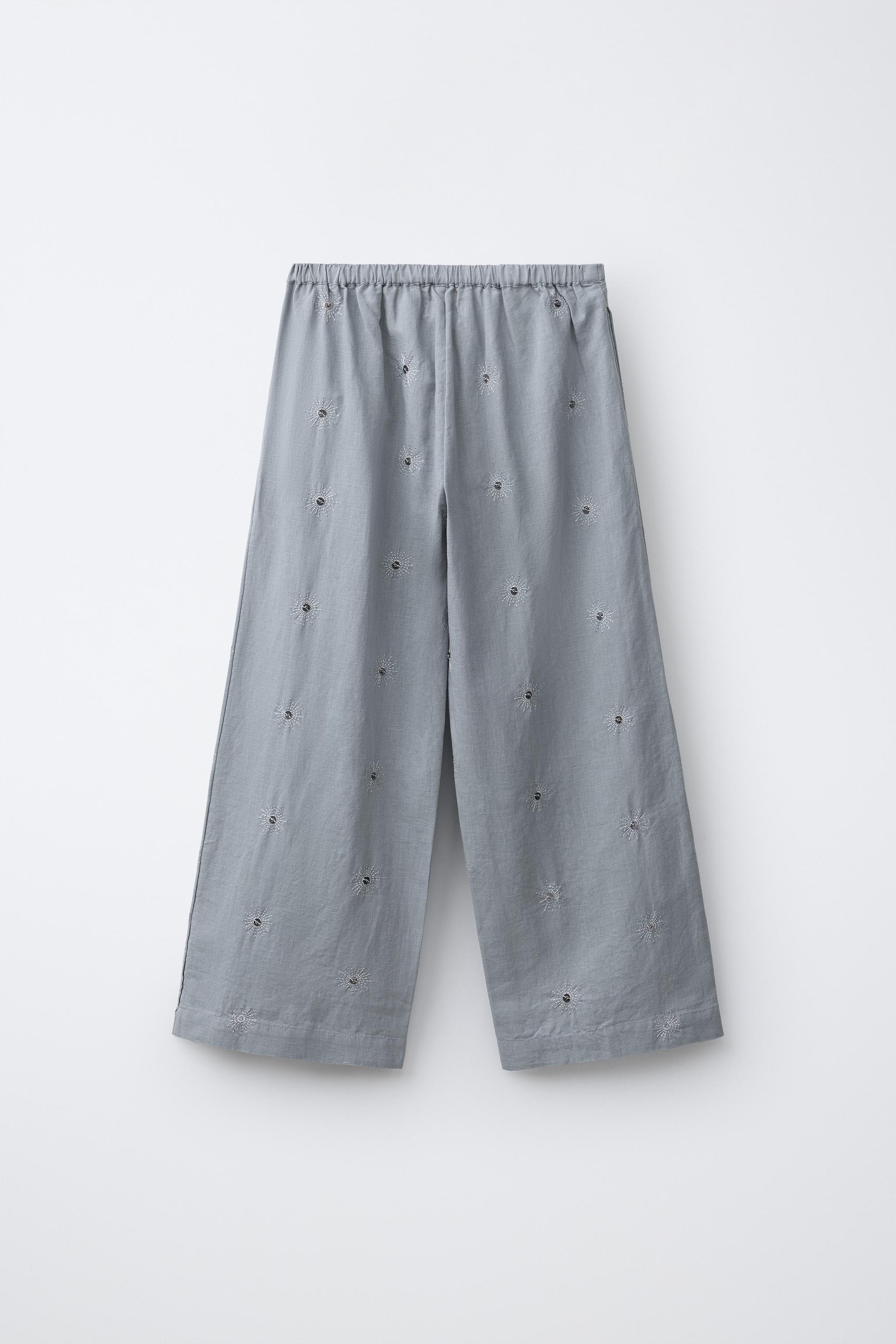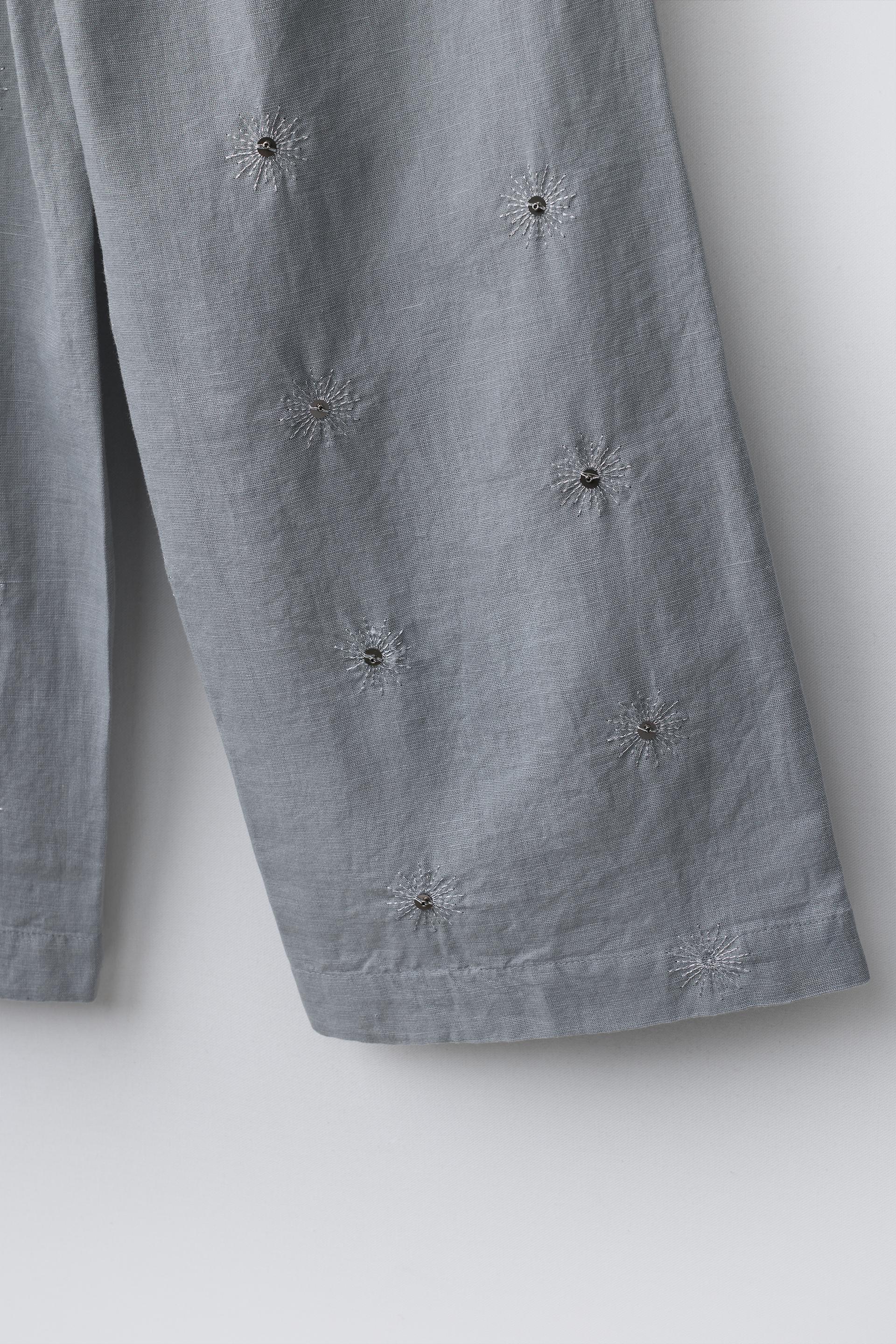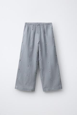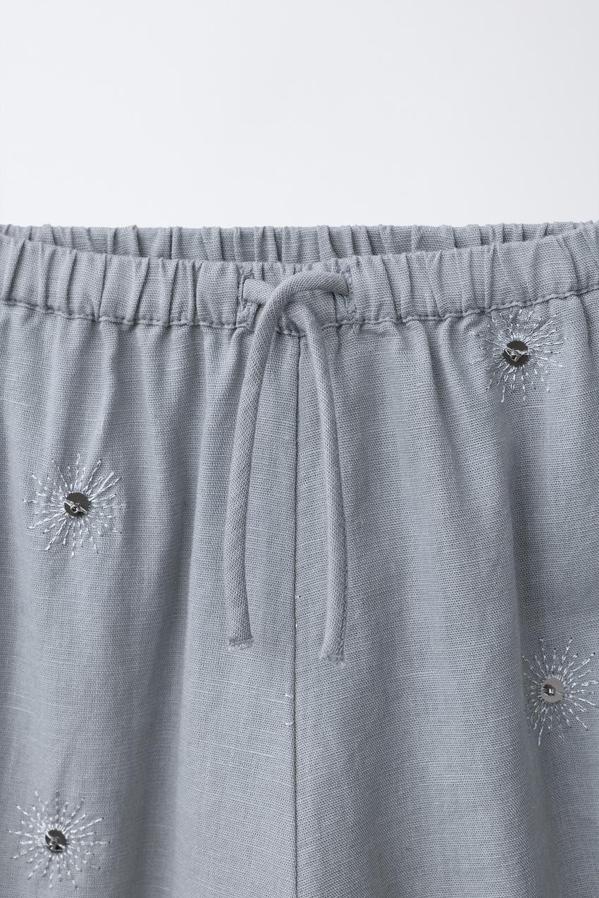 ZARA БРЮКИ С ПАЙЕТКАМИ ИЗ ХЛОПКА И ЛЬНА, СЕРЫЙ/СИНИЙ