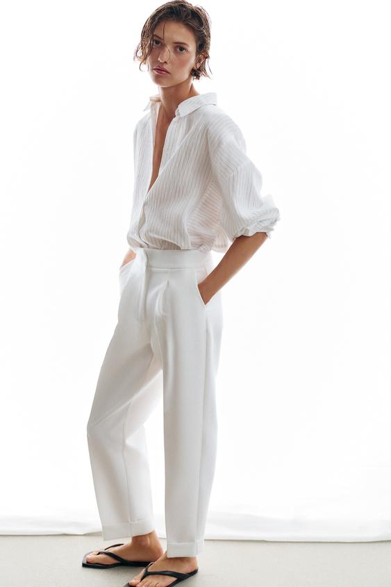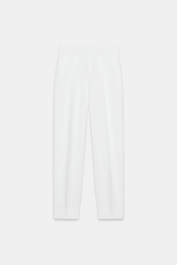 ZARA БРЮКИ С ЗАЩИПАМИ И ОТВОРОТАМИ СНИЗУ, БЕЛЫЙ