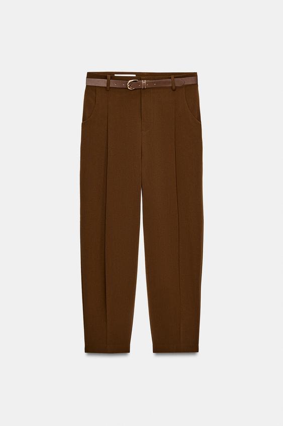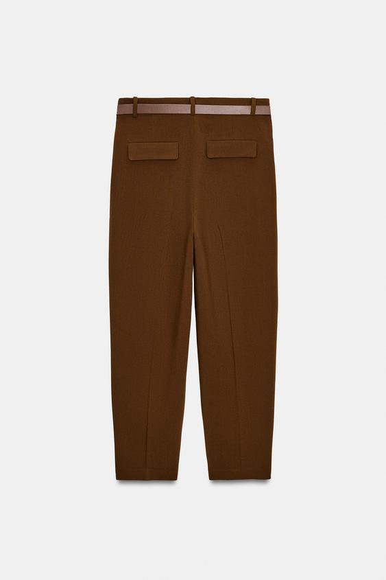 ZARA БРЮКИ С ЗАЩИПАМИ И РЕМНЕМ, КОРИЧНЕВЫЙ