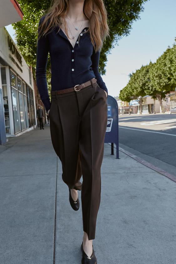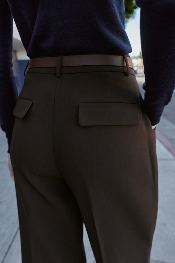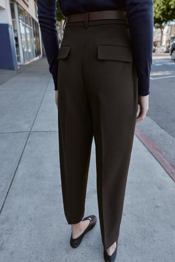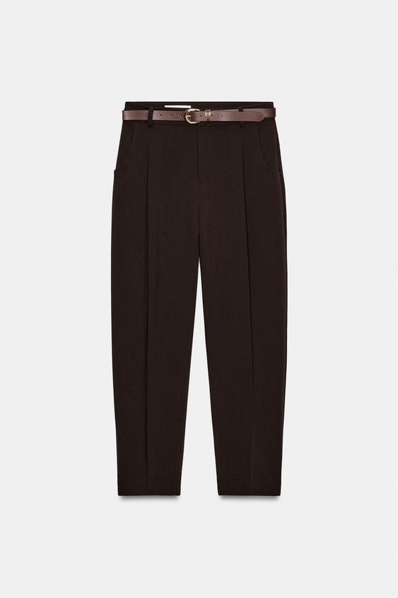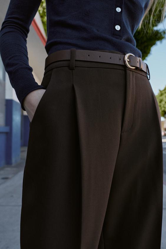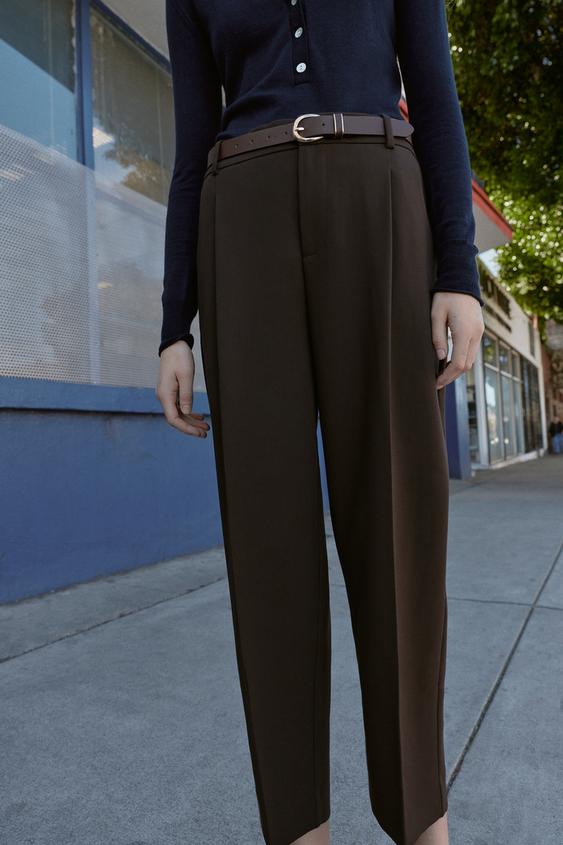 ZARA БРЮКИ С ЗАЩИПАМИ И РЕМНЕМ, ТЕМНО-КОРИЧНЕВЫЙ