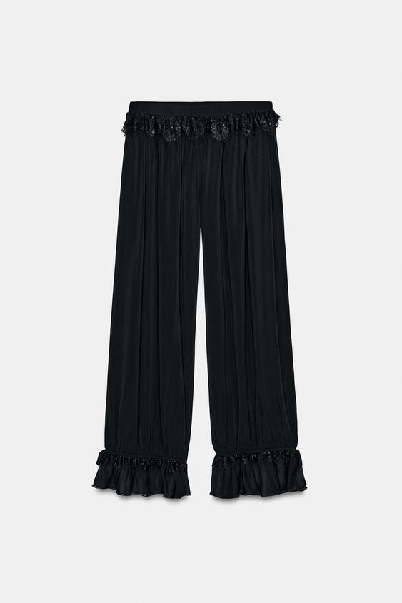 ZARA БРЮКИ-ШАРОВАРЫ С КРУЖЕВОМ, ЧЕРНЫЙ
