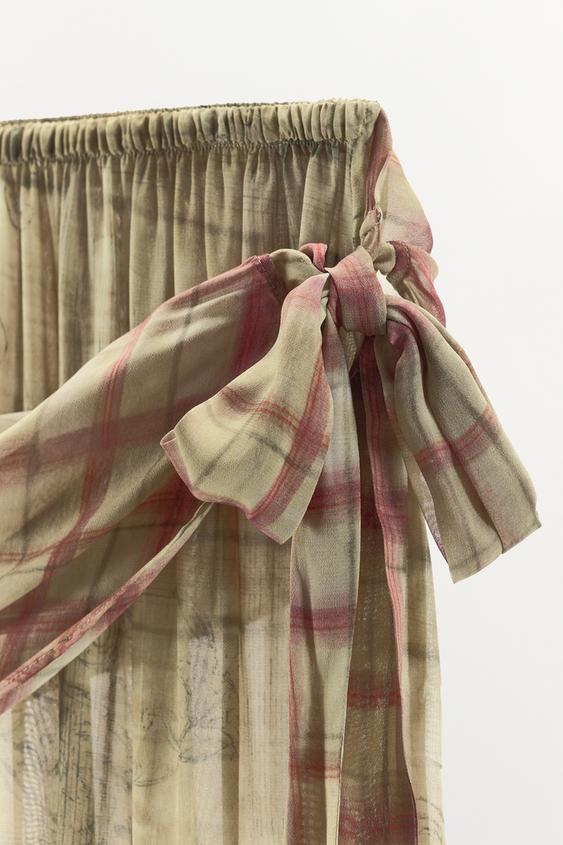 Брюки с принтом, выполненные из 100% вискозной пряжи. Средняя посадка, эластичный пояс. Накладная ткань в виде платка, регулируемая завязками. Объемный низ на резинке.