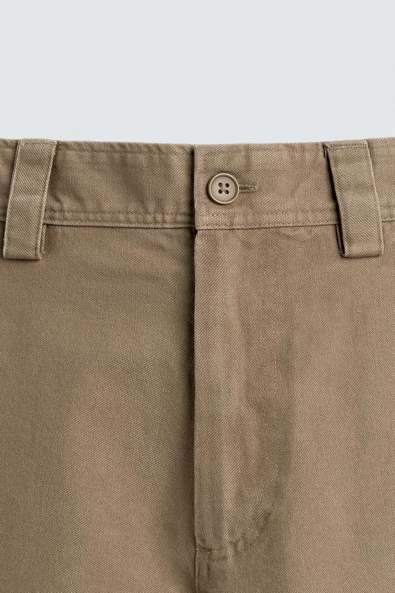 Брюки прямого кроя из хлопка с эффектом канваса. Передние карманы и задние накладные карманы. Штанины с вышивкой в тон. Эффект потертости. Застежка-молния и пуговица.