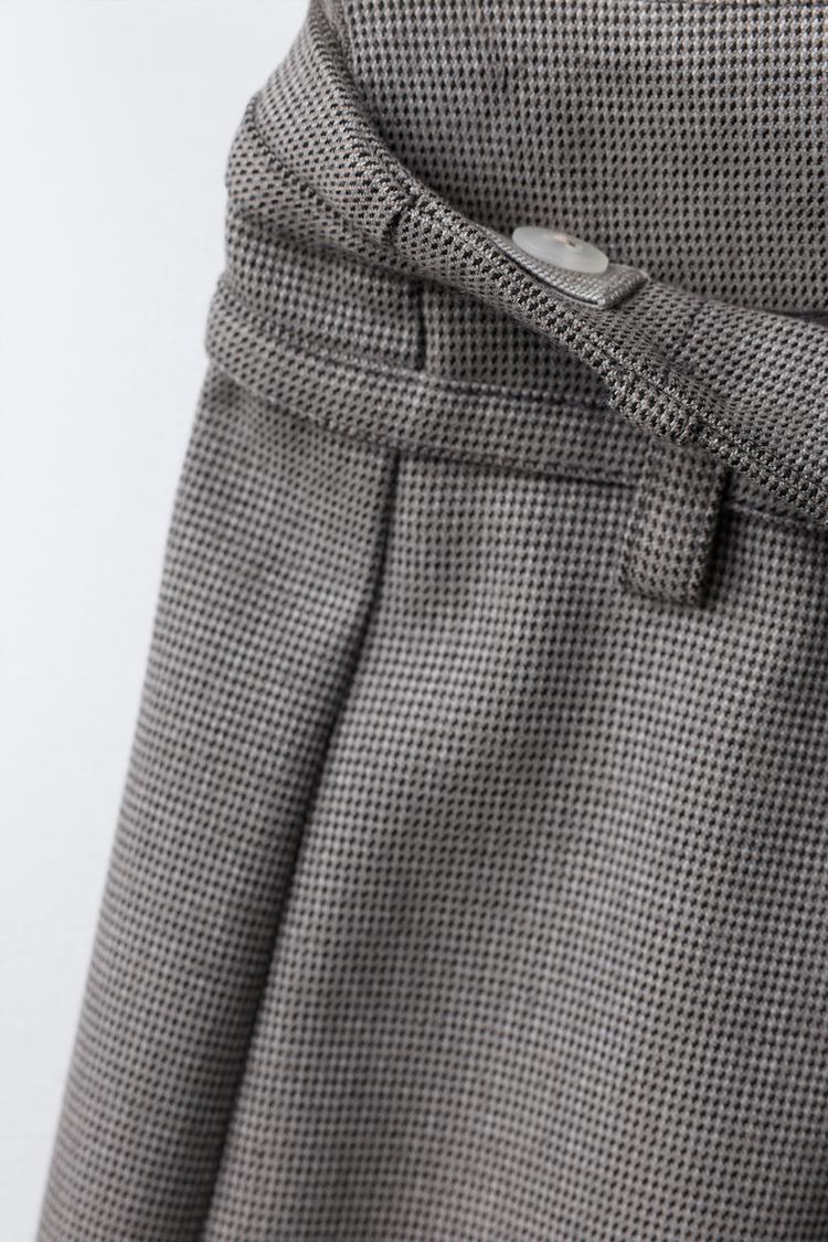 Брюки с широкими штанинами, регулируемым изнутри поясом и потайной боковой молнией. Двойной ремень. Декоративные прорезные карманы сзади. Принт «гусиная лапка» и декоративные складки спереди.