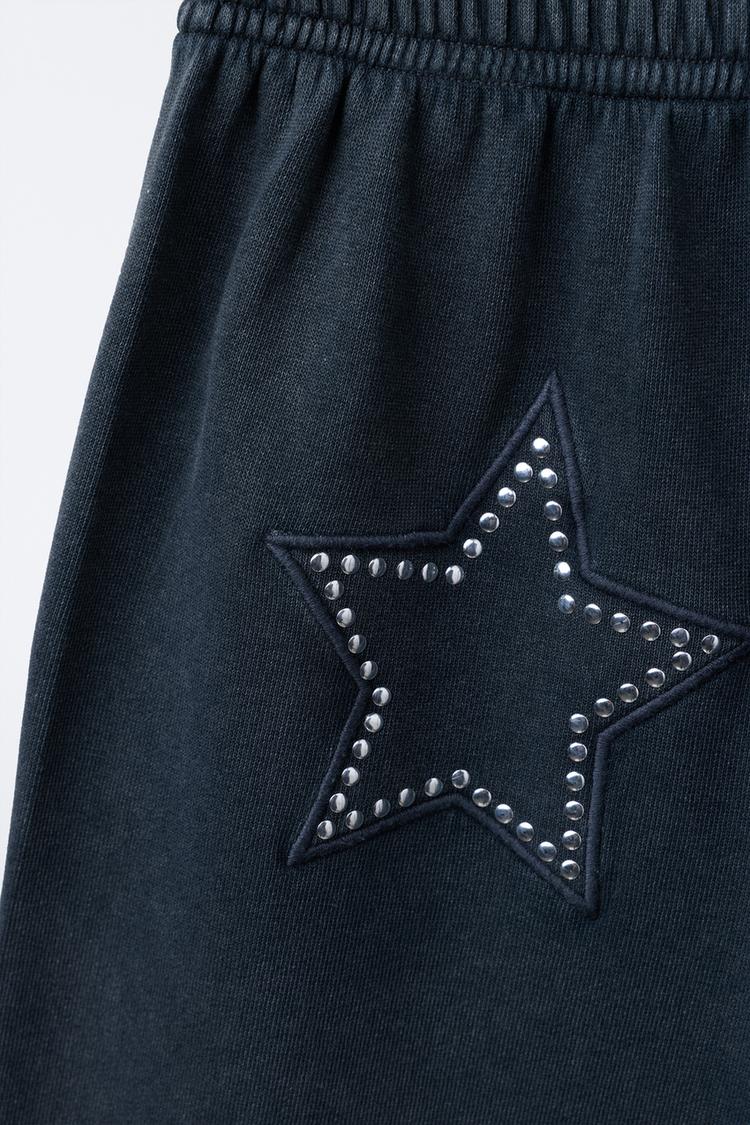 Брюки wide leg с эластичным поясом и регулируемыми шнурками спереди. Передние карманы. Аппликации в виде звезд на спине и заклепки. Ткань: 68% хлопок.