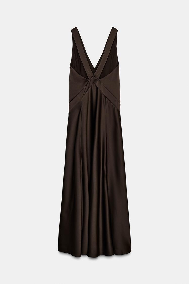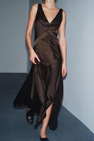 ZARA ДЛИННОЕ АТЛАСНОЕ ПЛАТЬЕ ZW COLLECTION LIMITED EDITION, ТЕМНО-КОРИЧНЕВЫЙ