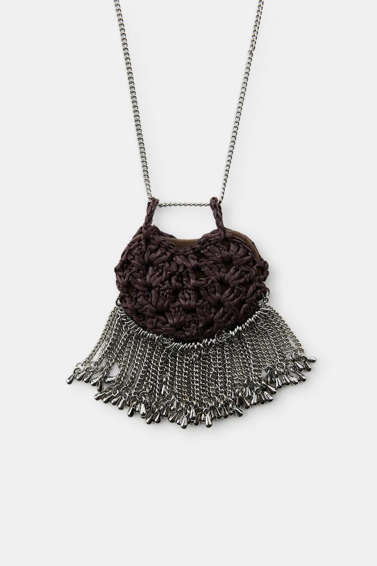 ZARA ДЛИННОЕ ОЖЕРЕЛЬЕ С СУМКОЙ, СВЯЗАННОЙ КРЮЧКОМ, КОРИЧНЕВЫЙ