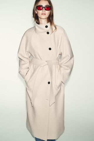 ZARA ДЛИННОЕ ПАЛЬТО ИЗ ШЕРСТИ С ВОРОТНИКОМ СТОЙКОЙ, БЕЖЕВЫЙ