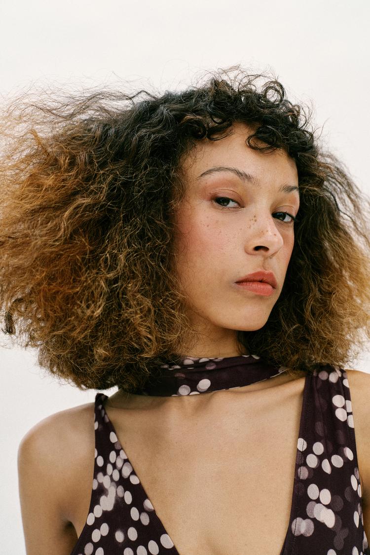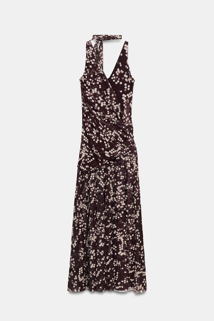 ZARA ДЛИННОЕ ПЛАТЬЕ ИЗ ПОЛУПРОЗРАЧНОЙ ТКАНИ В ГОРОШЕК, КОРИЧНЕВЫЙ/ЭКРЮ