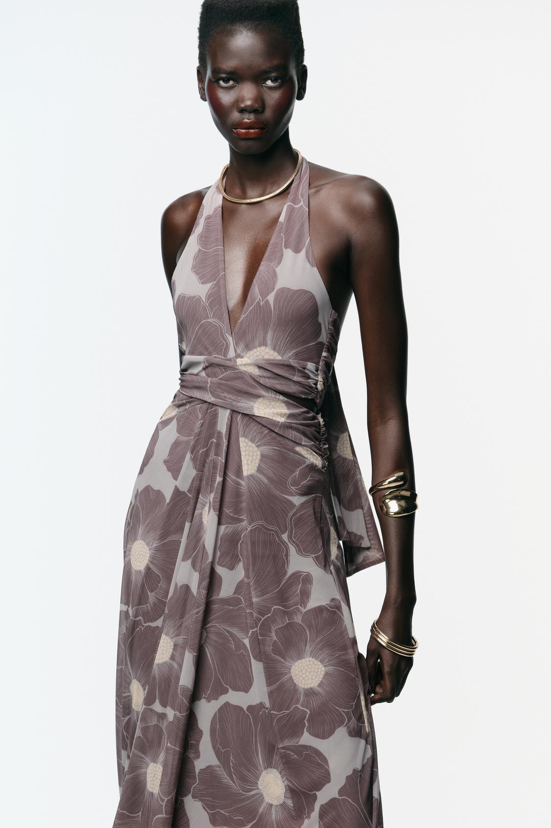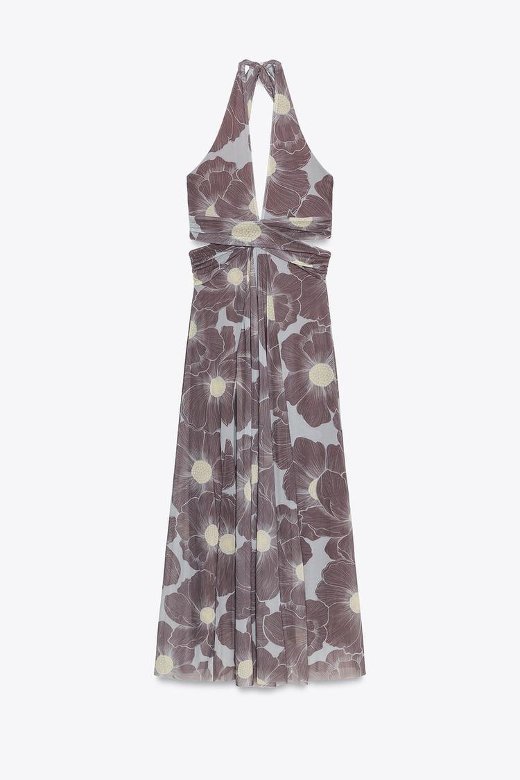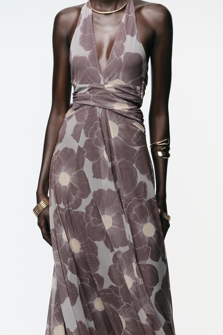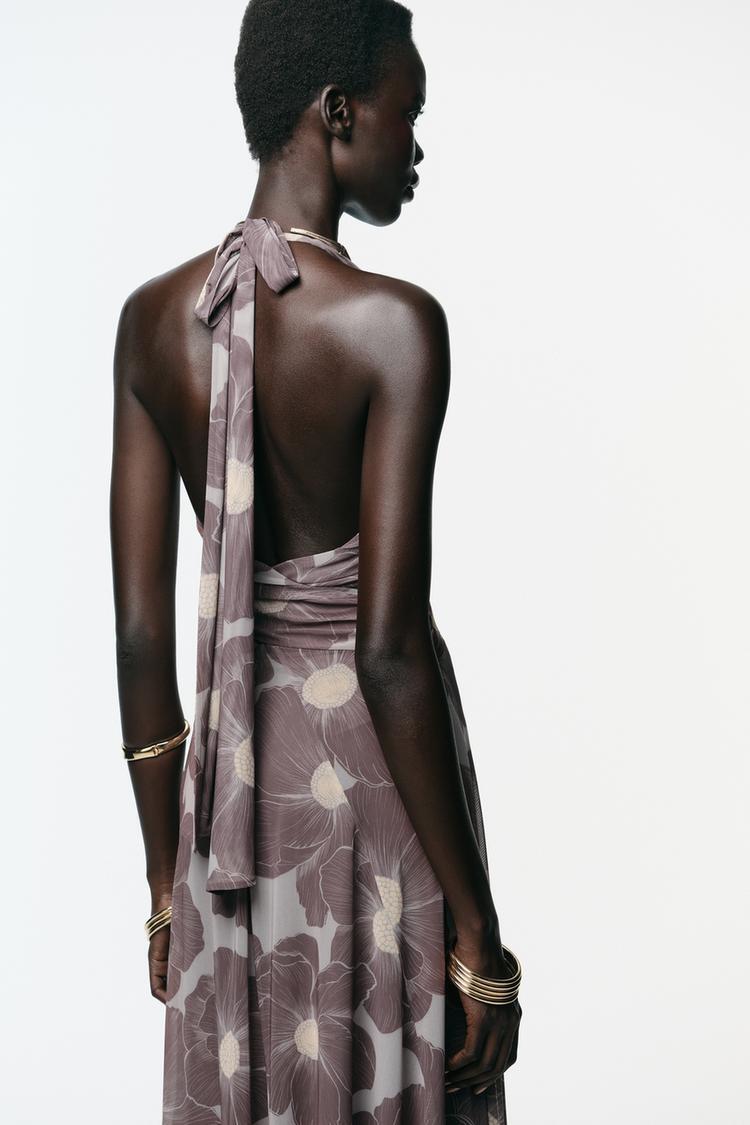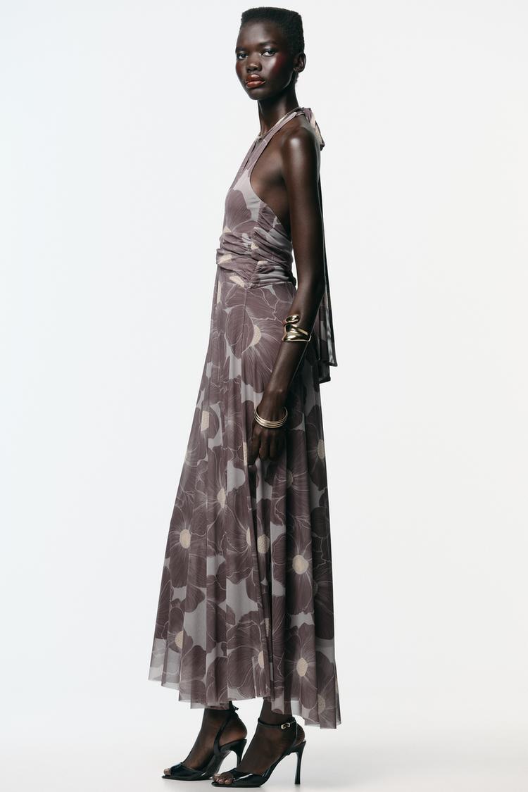 ZARA ДЛИННОЕ ПЛАТЬЕ ИЗ ТЮЛЯ С ПРИНТОМ И ВЫРЕЗАМИ, СЕРО-КОРИЧНЕВЫЙ