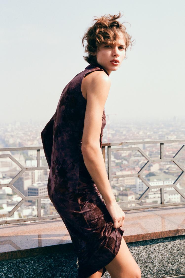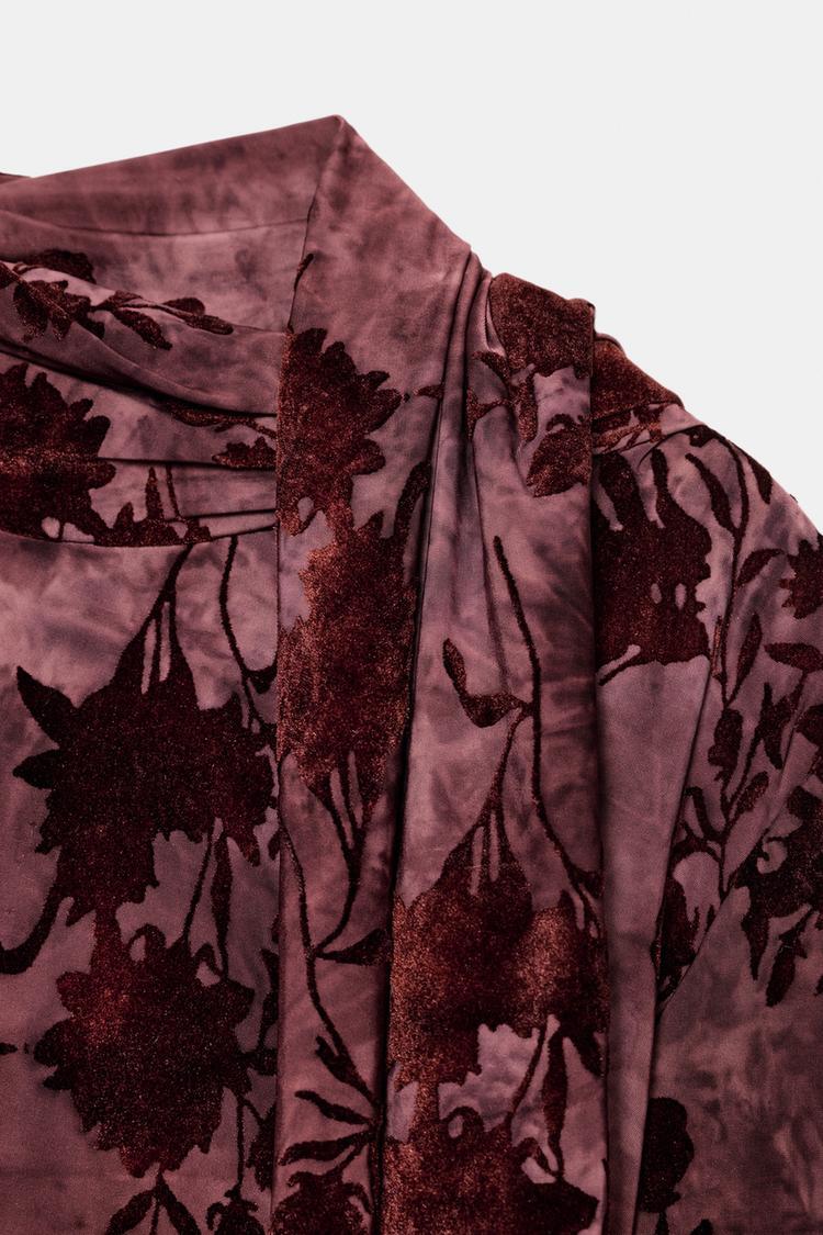 ZARA ДЛИННОЕ ПЛАТЬЕ С ПРИНТОМ И ПЛАТКОМ, СВЕТЛО-ГРАНАТОВЫЙ