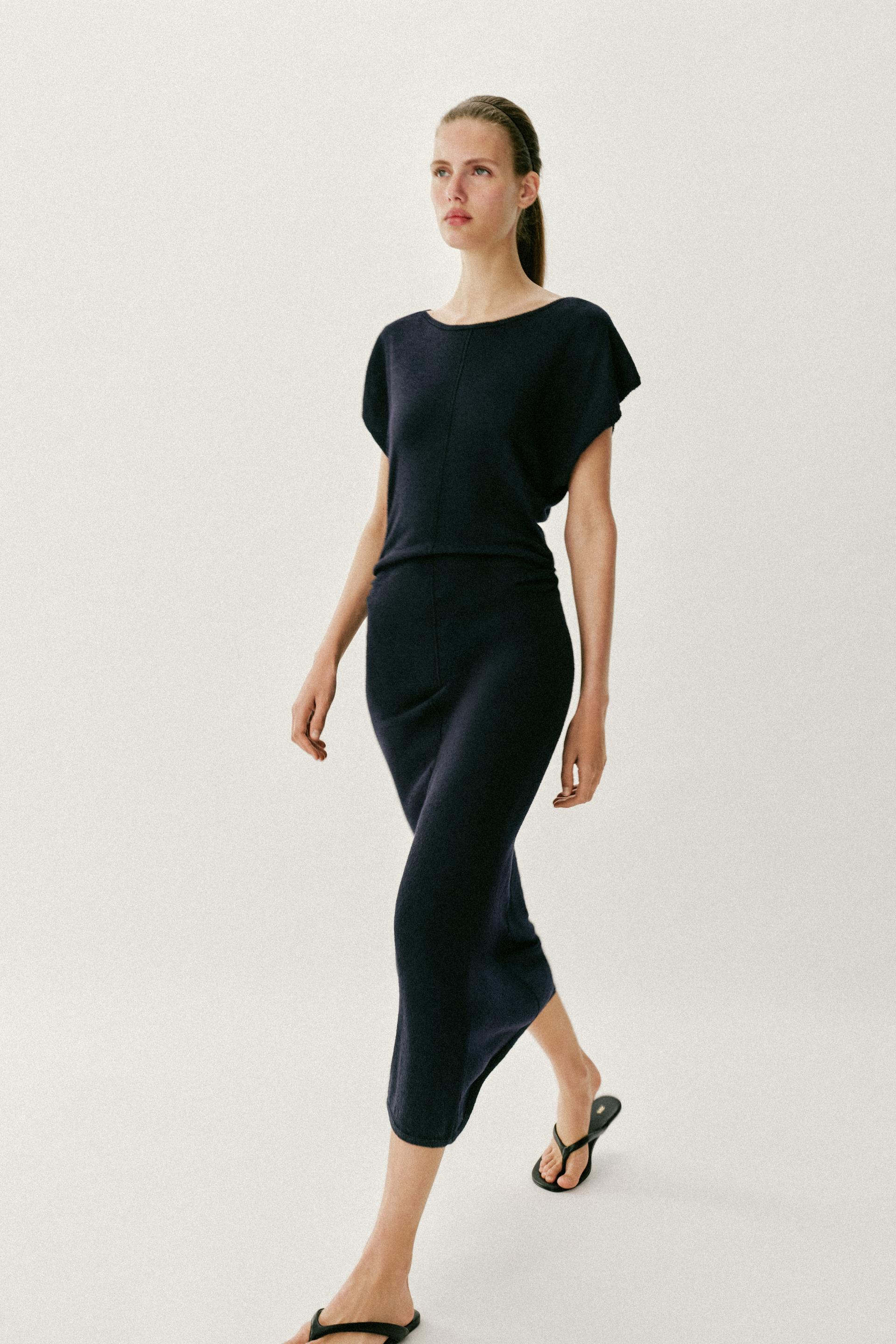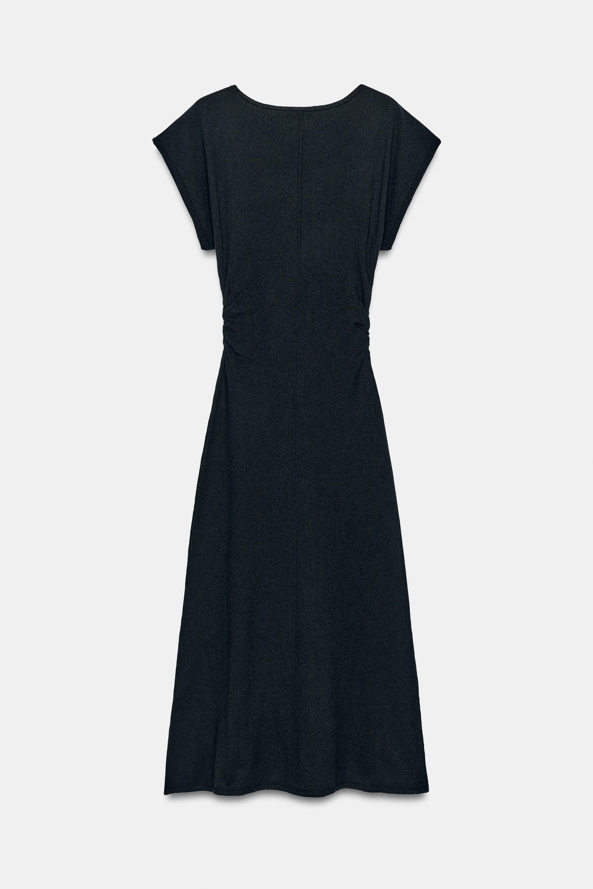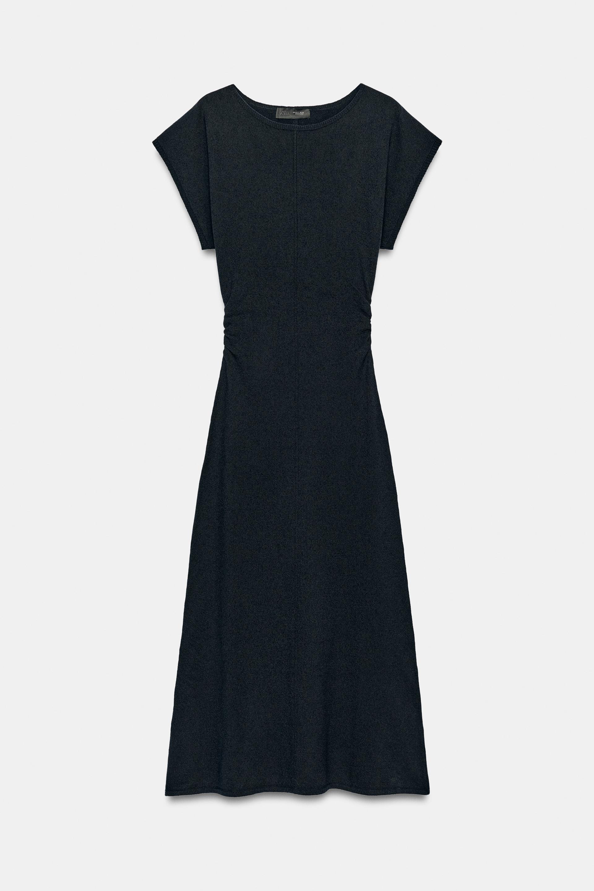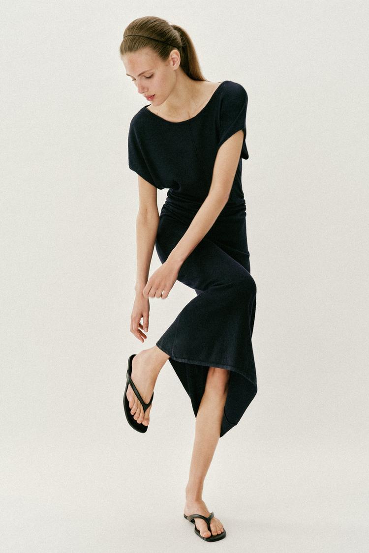 ZARA ДЛИННОЕ ТРИКОТАЖНОЕ ПЛАТЬЕ СО СБОРКАМИ ПО БОКАМ, МОРСКОЙ СИНИЙ