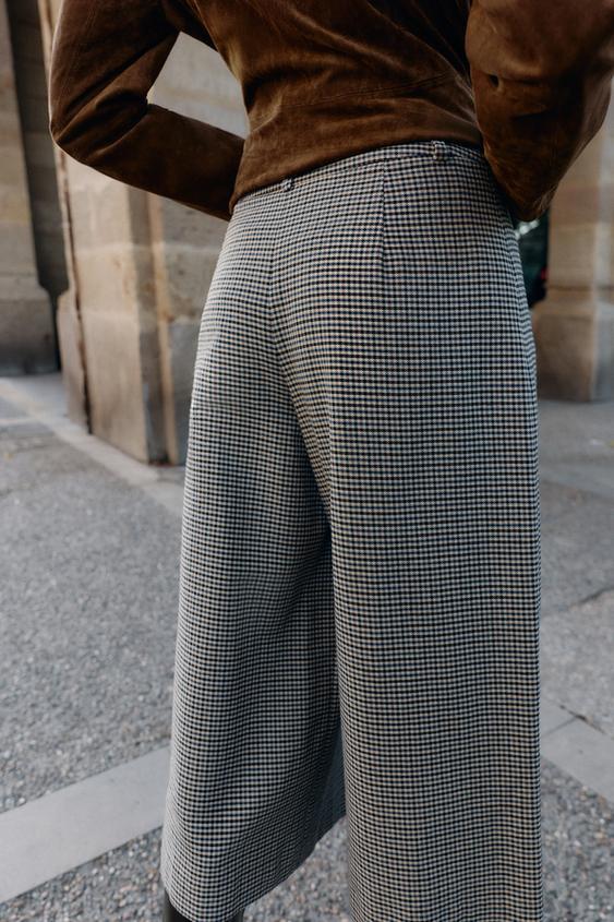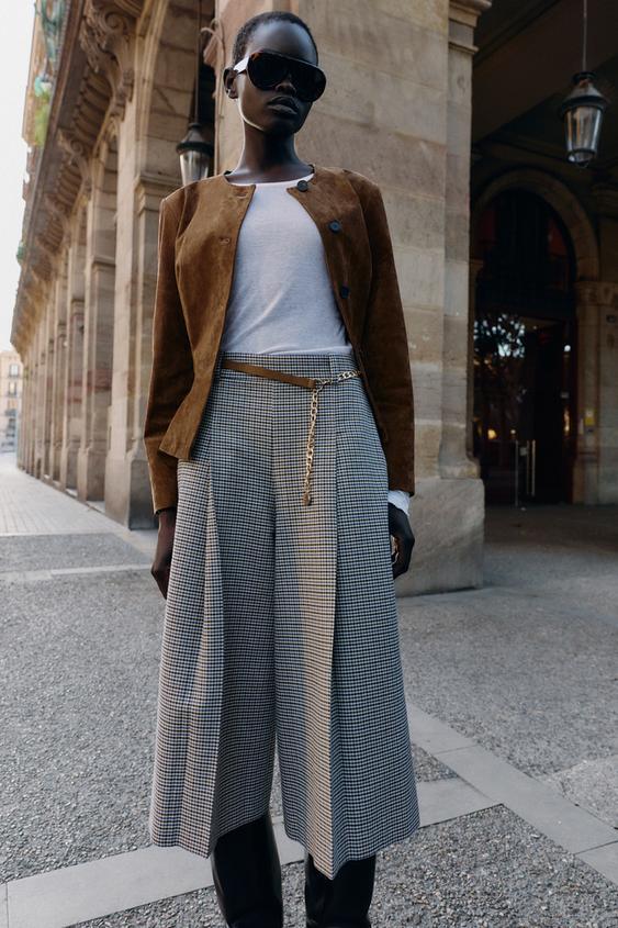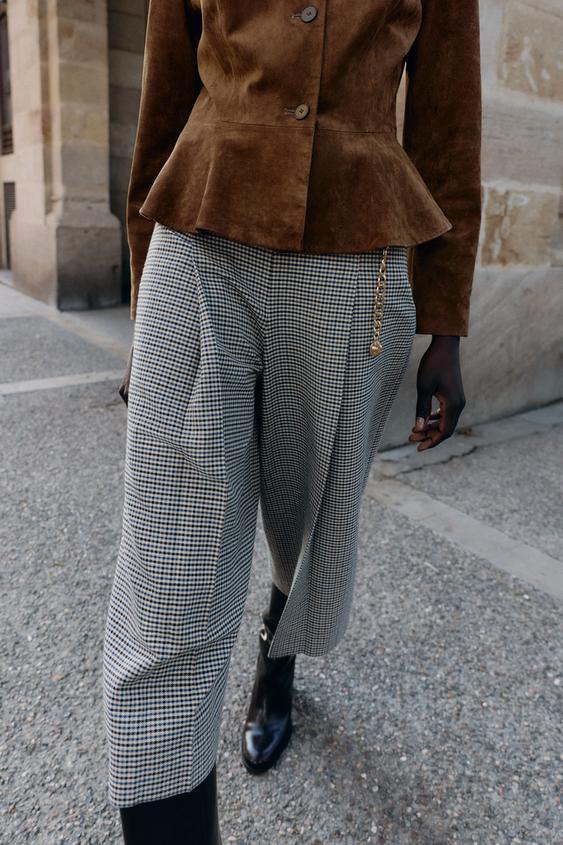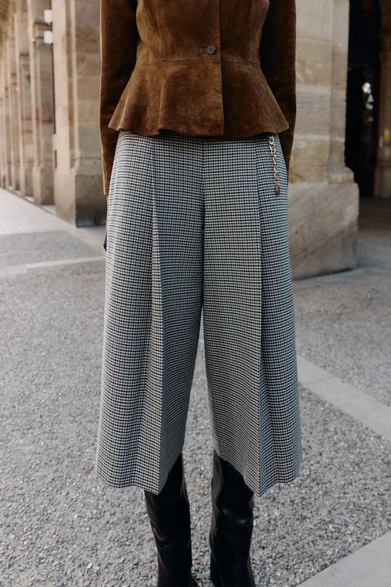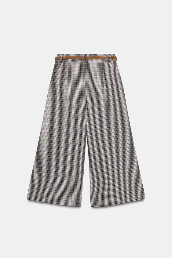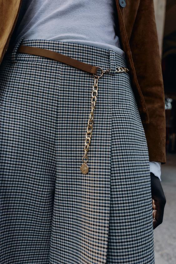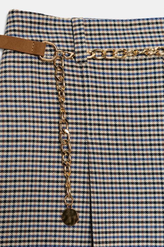 ZARА ДЛИННЫЕ БЕРМУДЫ «ГУСИНАЯ ЛАПКА» С РЕМНЕМ И ЦЕПОЧКОЙ, ЭКРЮ/СИНИЙ