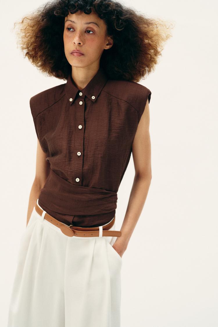 Шорты с высокой посадкой, защипами и ремнем. Передние карманы. Потайная застежка-молния сбоку.