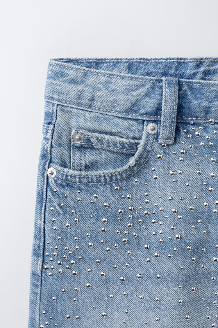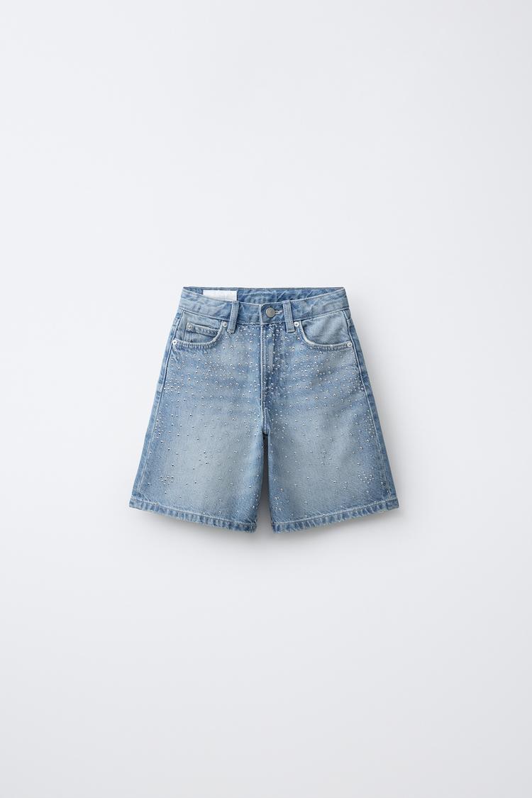 ZARA ДЛИННЫЕ ДЖИНСОВЫЕ ШОРТЫ СО СТРАЗАМИ, СИНИЙ