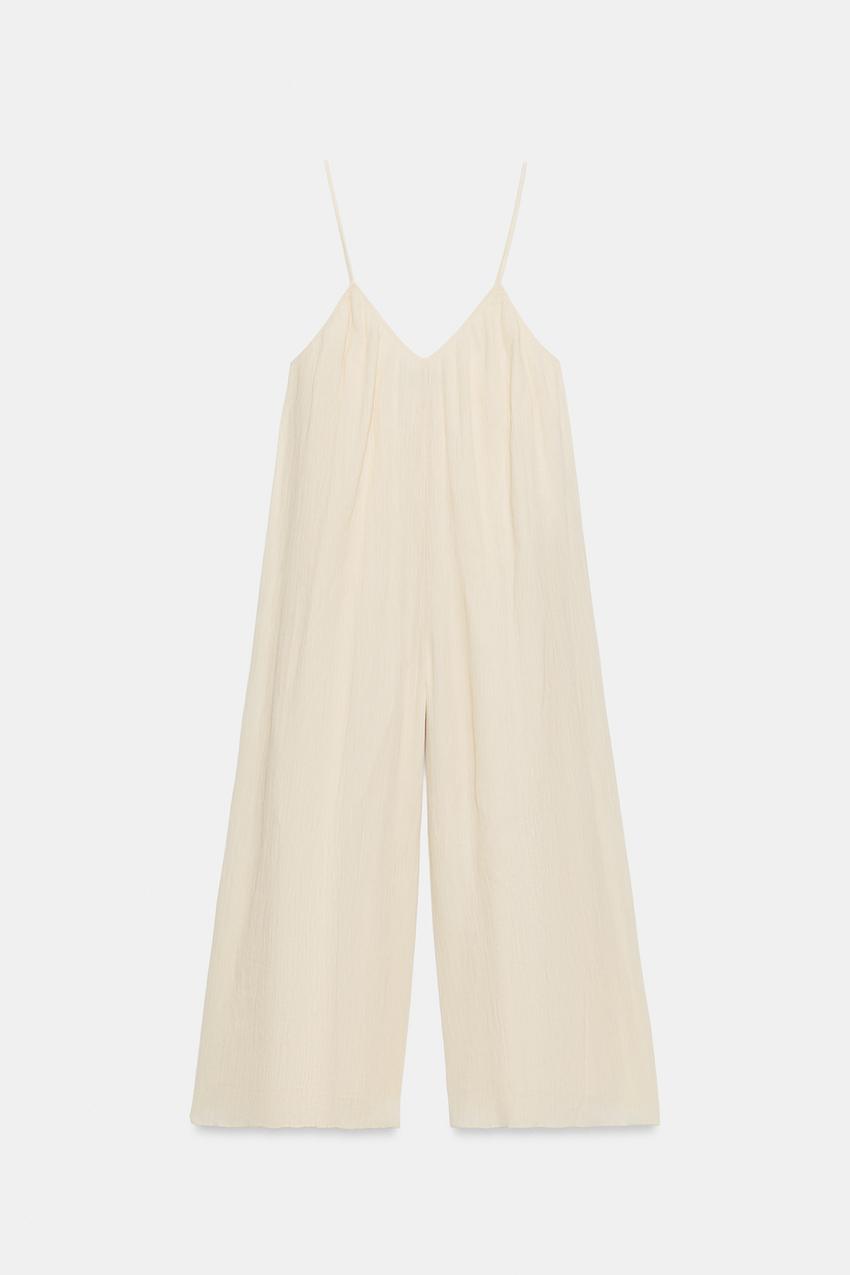 Комбинезон с V-образным вырезом и тонкими регулируемыми бретелями. Ткань с эффектом мятой текстуры. Внутренняя подкладка в тон. Очень широкие штанины.