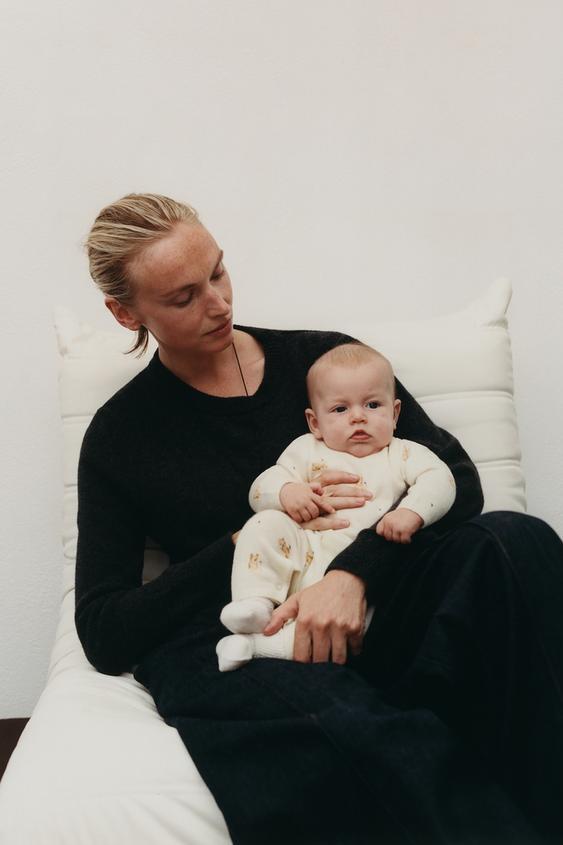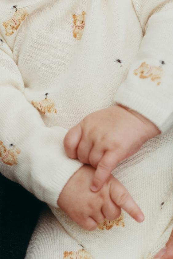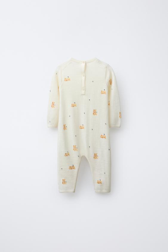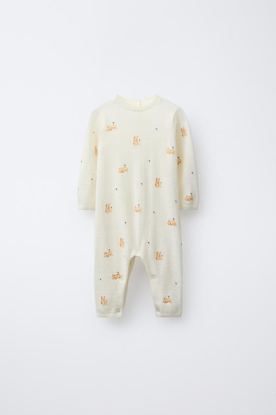 ZARA ДЛИННЫЙ КОМБИНЕЗОН С МИШКАМИ ИЗ 100% ШЕРСТИ МЕРИНОСА, СЛОНОВАЯ КОСТЬ