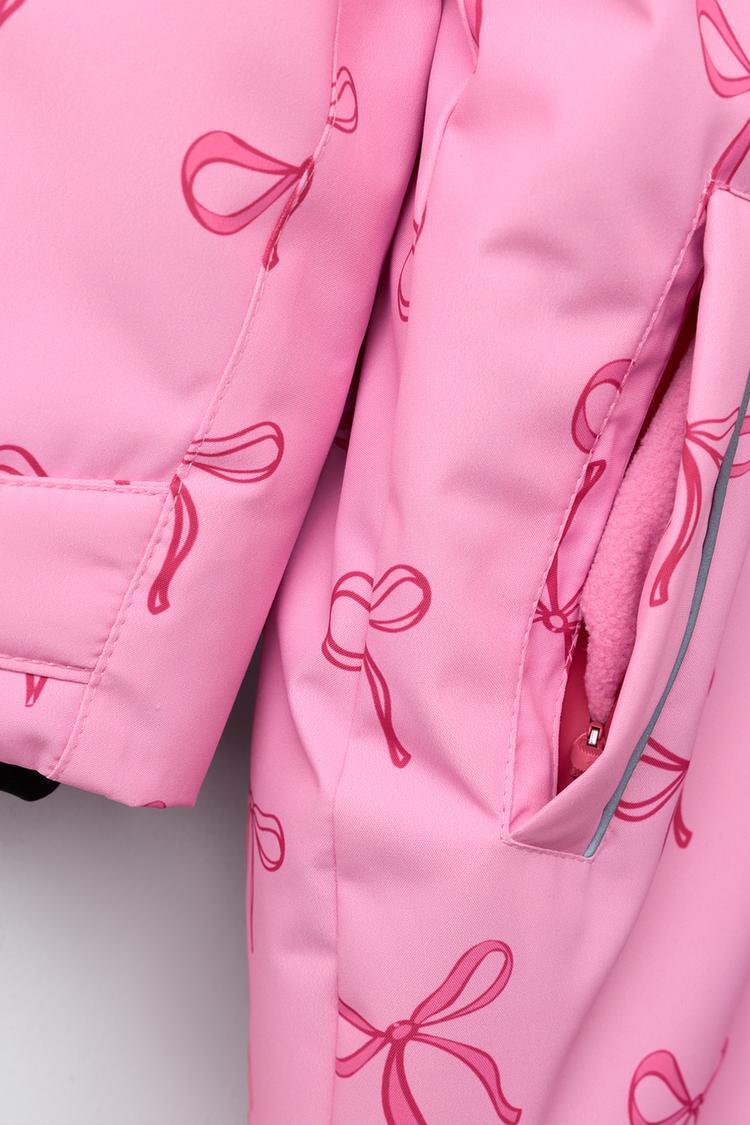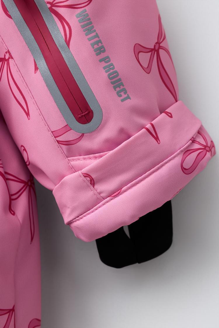 Длинный комбинезон из специальной водо- и ветроустойчивой ткани с теплоизоляцией для холодной погоды. С капюшоном и высоким воротником на липучке. Длинные рукава с внутренними манжетами с отверстием для большого пальца и регулируемыми липучками на запястьях, карман на рукаве для ски-пасса. Термогерметичная передняя молния. Эластичная резинка на спине. Передние карманы с термогерметичными молниями, внутренняя подкладка из флиса. Низ с боковыми кнопками и эластичными внутренними манжетами для заправки в обувь, предотвращающими попадание снега и холода. Светоотражающая полоса на карманах и по низу. Внутренняя подкладка из флиса. Принт с бантами.