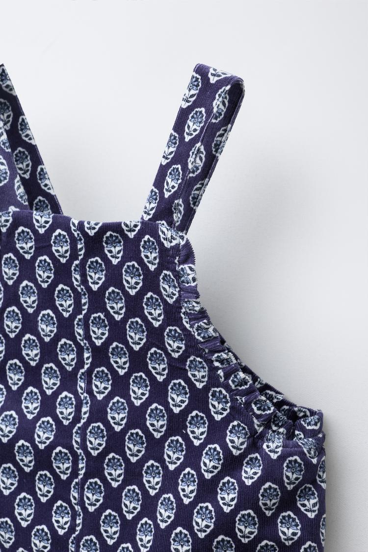 Длинный вельветовый комбинезон с квадратным вырезом и бретелями. Воланы и цветочный принт.