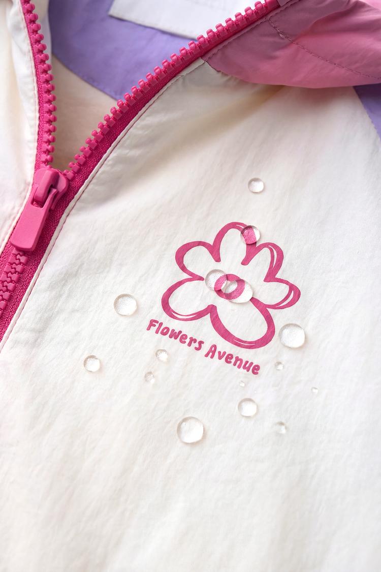 Дождевик из специальной водоотталкивающей ткани, с капюшоном и длинными рукавами. Эластичные манжеты. Застежка-молния. Передние карманы и цветочный принт на груди.