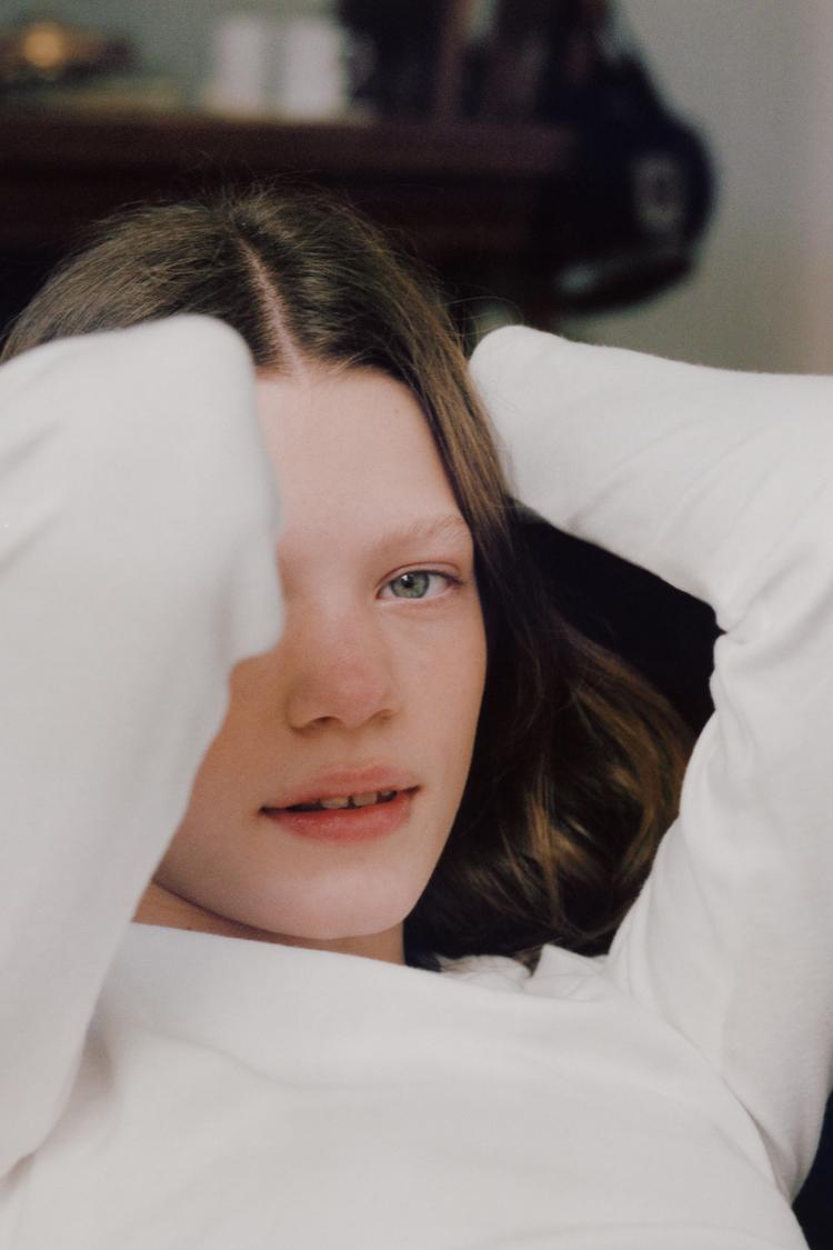 Двойная футболка с круглым вырезом и длинными рукавами. Двойной нижний край. Изготовлена из 49% модала.