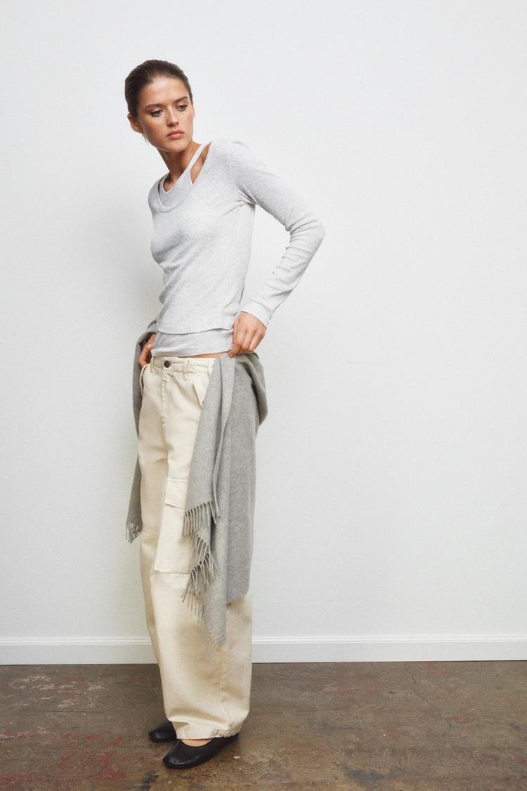 ZARA ДВОЙНАЯ ФУТБОЛКА В РУБЧИК, СЕРЫЙ МЕЛАНЖ