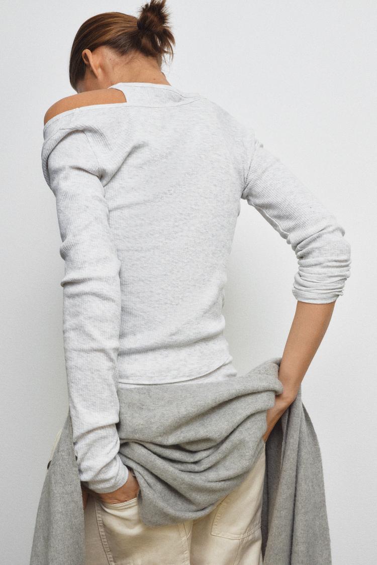 Футболка из хлопковой пряжи в рубчик. Круглый вырез и длинные рукава. Деталь внутренней футболки с проймой из той же ткани.