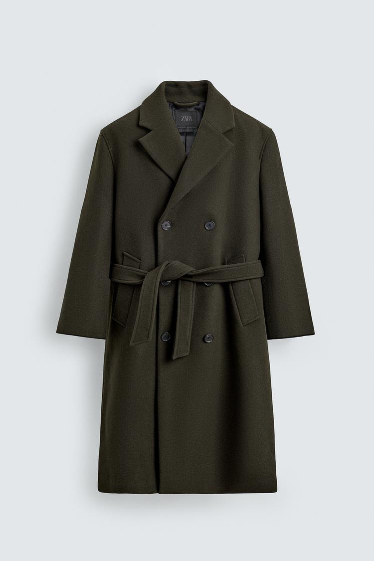 ZARA ДВУБОРТНОЕ ПАЛЬТО ИЗ ШЕРСТИ С ПОЯСОМ, ТЕМНЫЙ ХАКИ