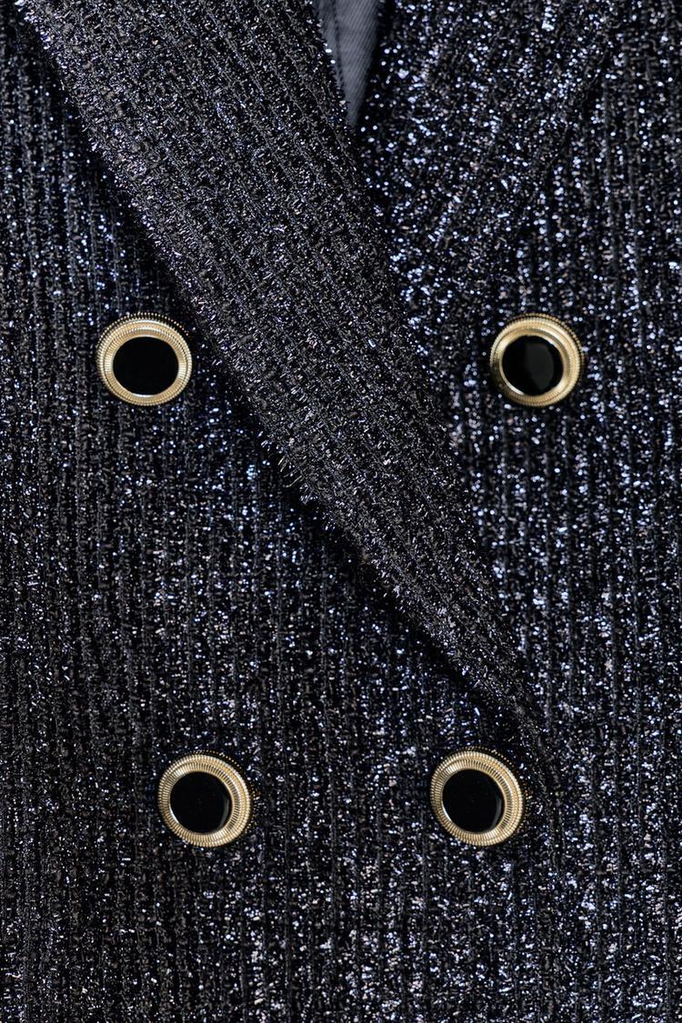 Двубортный блейзер с длинными рукавами и воротником с лацканами. Подплечники. Передние карманы с клапанами. Ткань с металлизированной нитью. Застегивается на пуговицы.