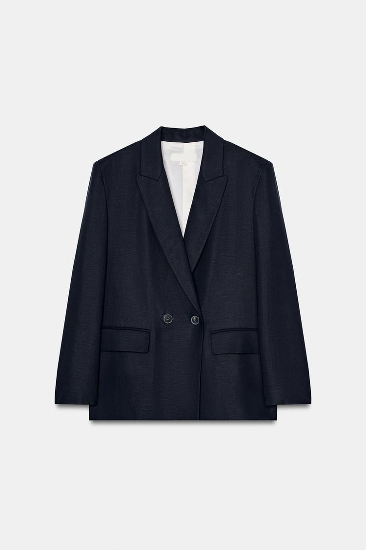 ZARA ДВУБОРТНЫЙ ЛЬНЯНОЙ БЛЕЙЗЕР СО СКАТАННЫМИ РУКАВАМИ, МОРСКОЙ СИНИЙ