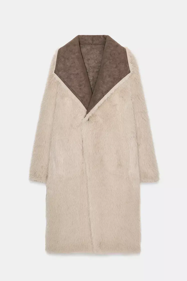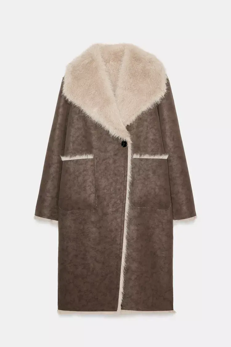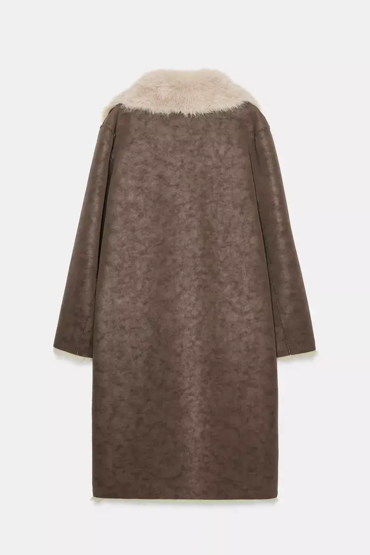 ZARA ДВУСТОРОННЕЕ ПАЛЬТО ИЗ ИСКУССТВЕННОГО МЕХА, СЕРО-КОРИЧНЕВЫЙ