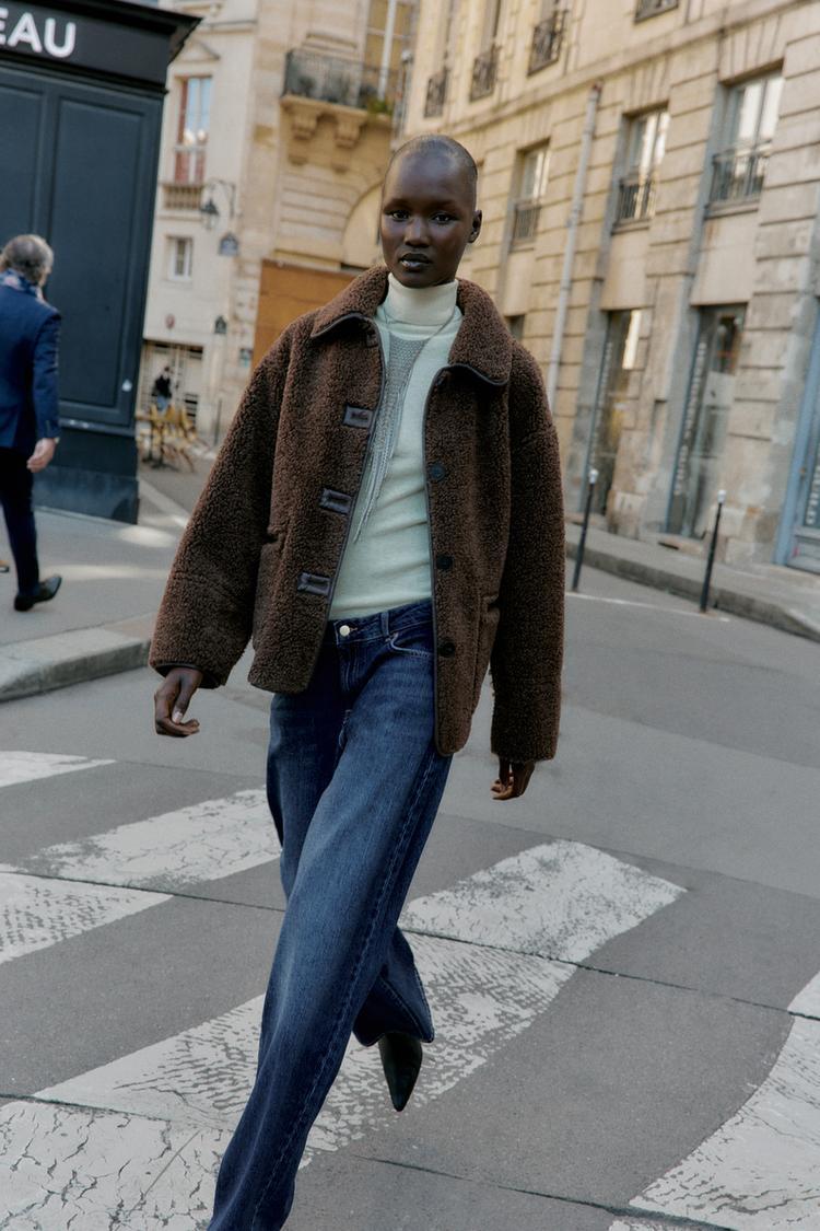 Пальто с отложным воротником и длинными рукавами. Передние карманы. Детали из комбинированной ткани с эффектом замши и искусственной овчины. Застежка на пуговицы спереди.