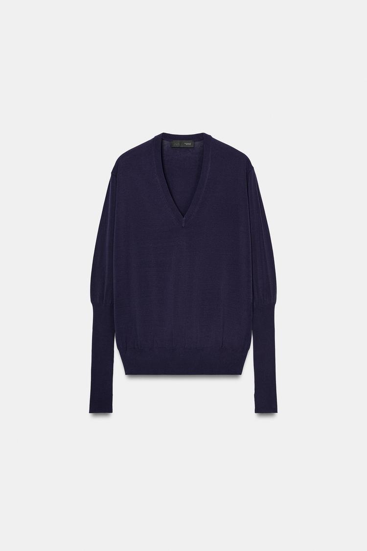ZARA ДЖЕМПЕР ИЗ ТОНКОГО ТРИКОТАЖА С V-ОБРАЗНЫМ ВЫРЕЗОМ, ЧЕРНИЛЬНО-СИНИЙ