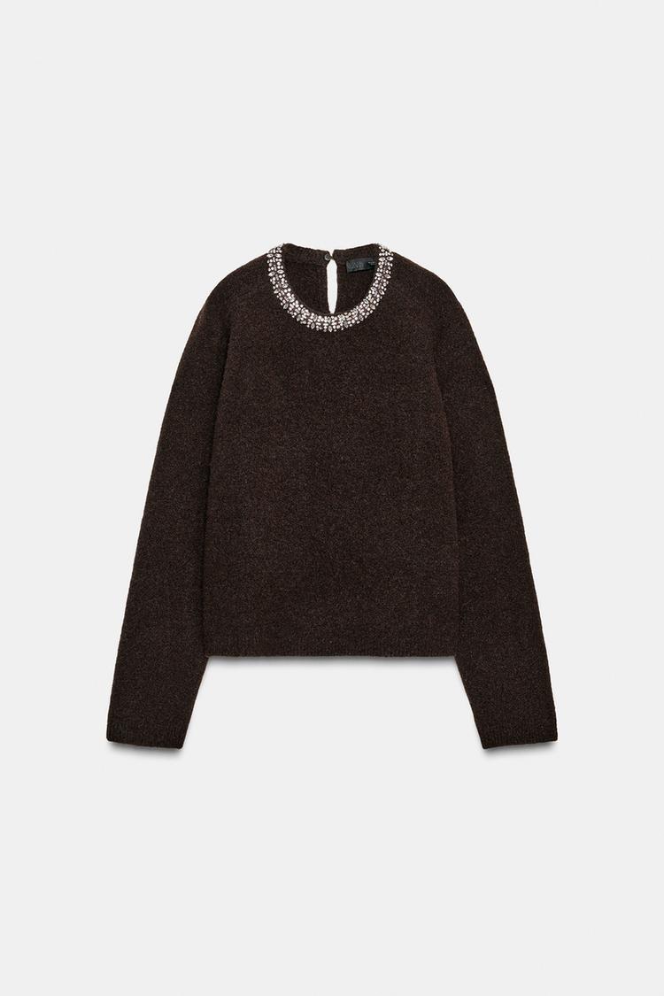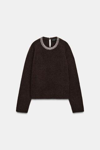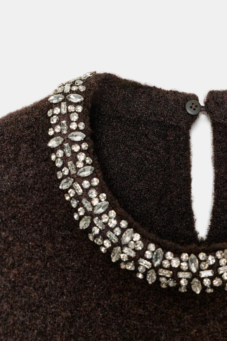 ZARA ДЖЕМПЕР ИЗ ТРИКОТАЖА СО СТРАЗАМИ НА ВОРОТНИКЕ, КОРИЧНЕВЫЙ