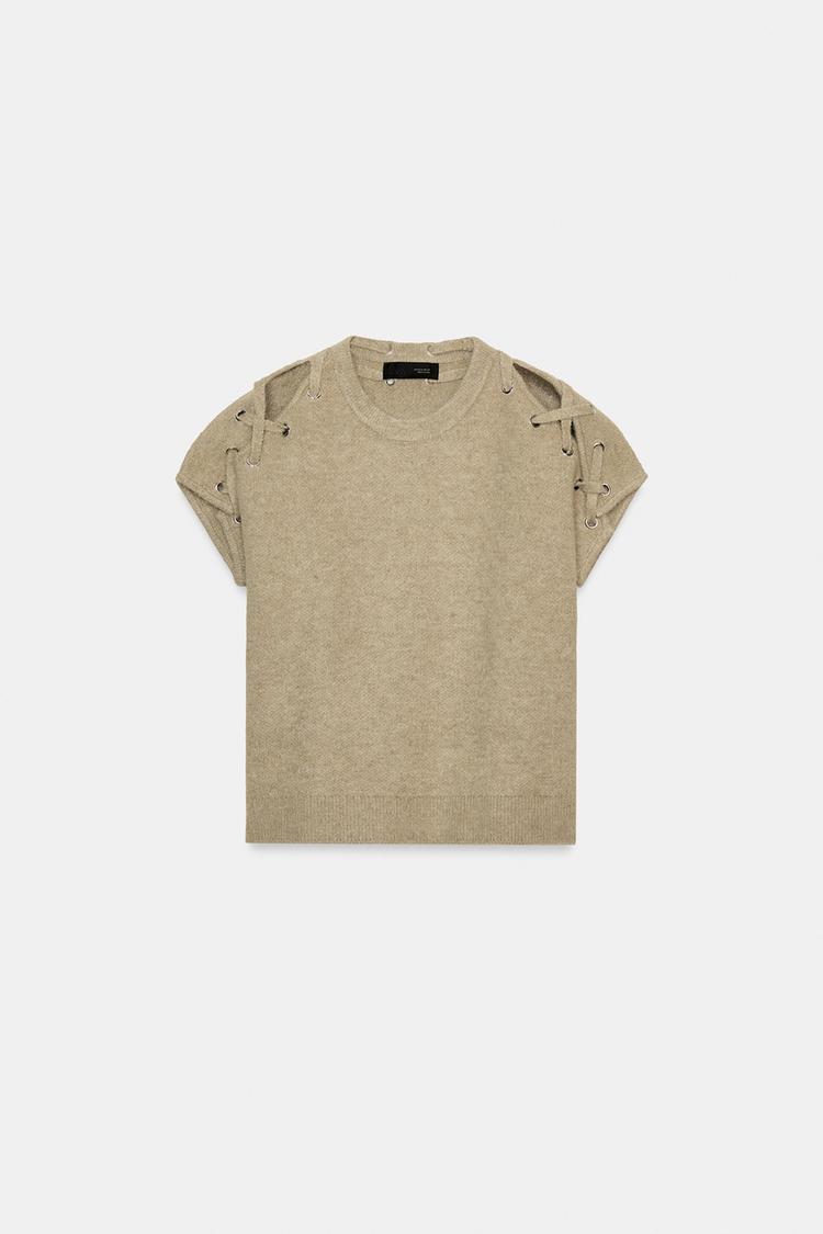 Однотонный джемпер с круглым вырезом и короткими рукавами. Отделка в виде люверсов на плечах.