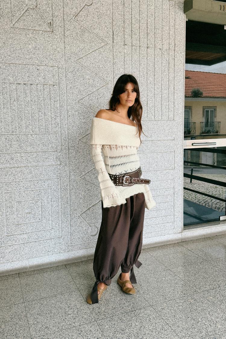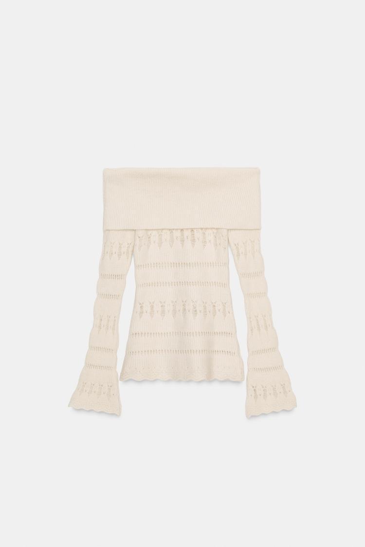 ZARA ДЖЕМПЕР С ОТКРЫТЫМИ ПЛЕЧАМИ И АЖУРНОЙ ВЯЗКОЙ, ЭКРЮ