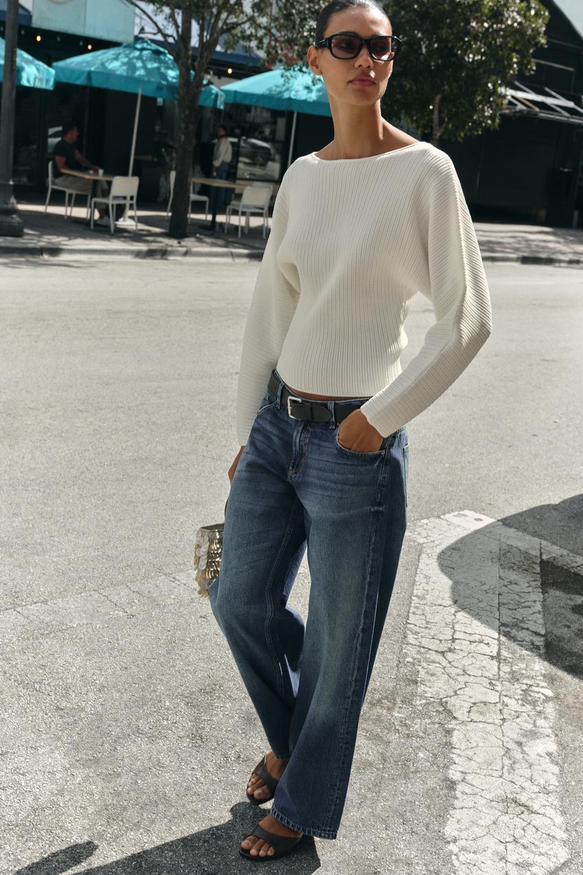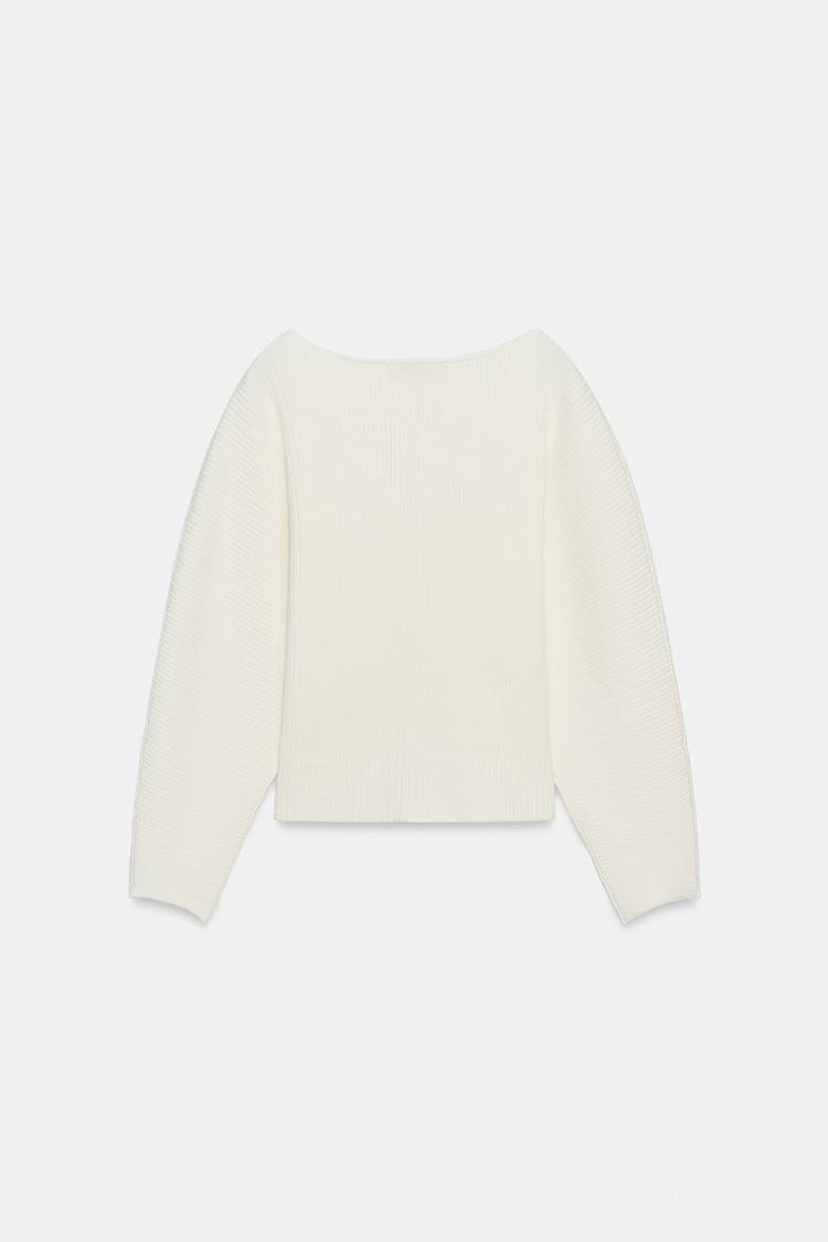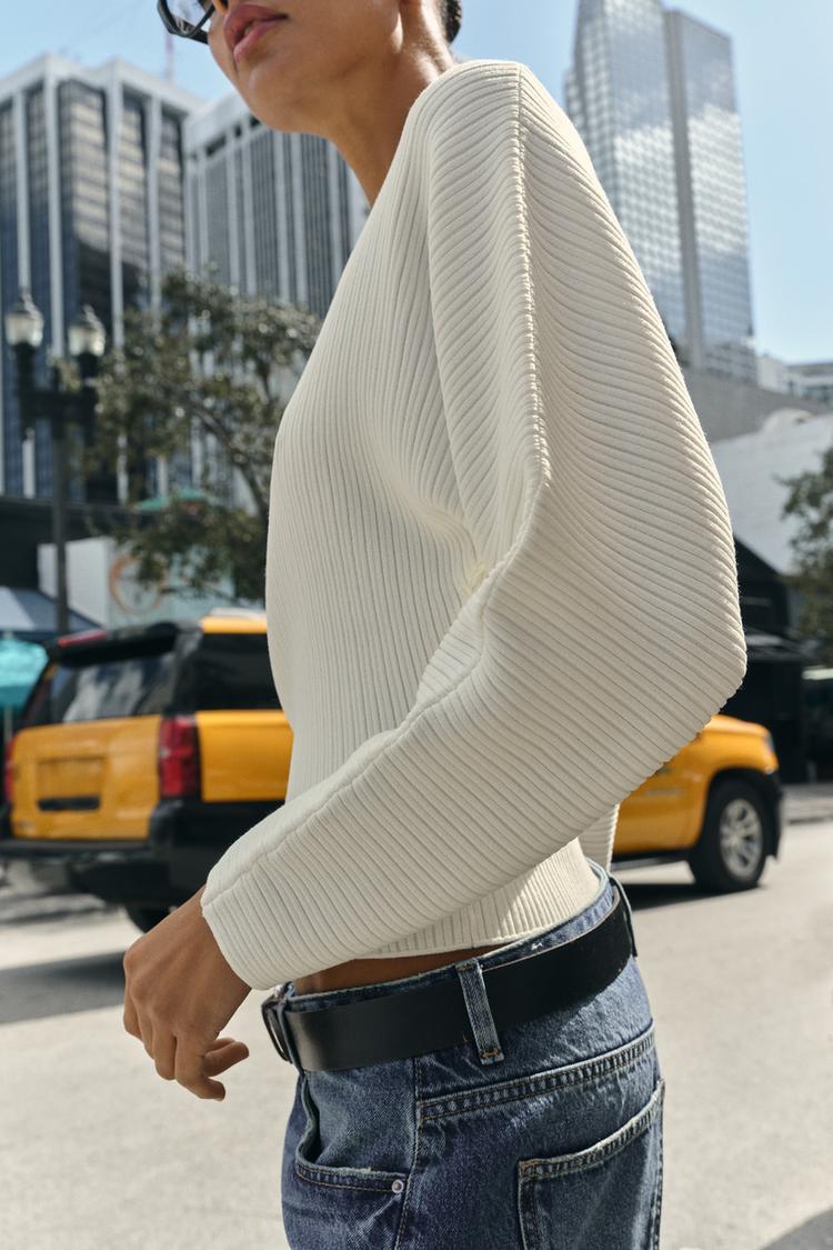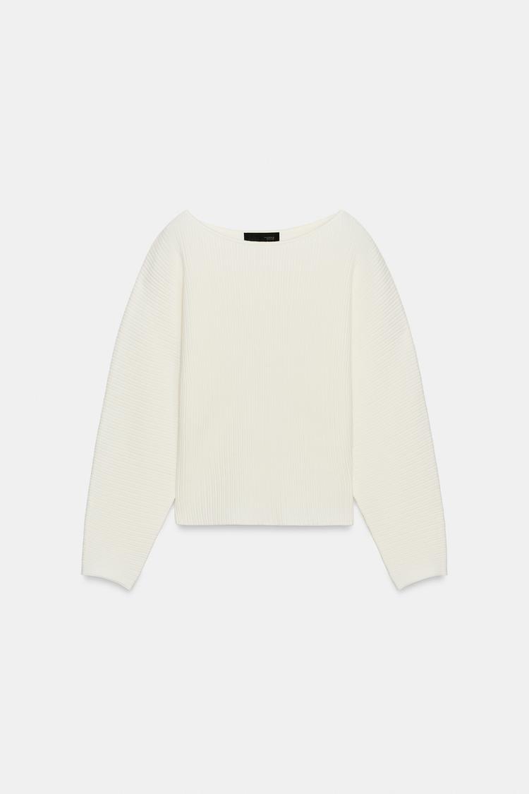 Джемпер в рубчик с вырезом лодочкой и длинными рукавами с широкой проймой.