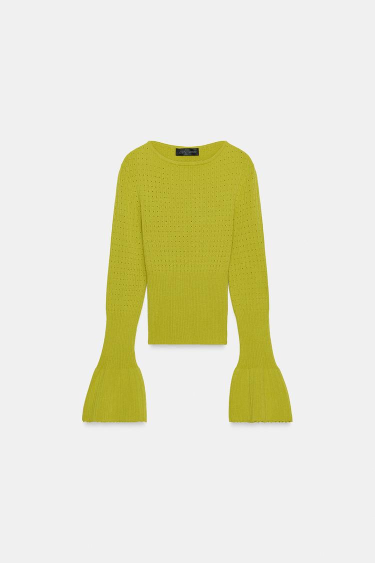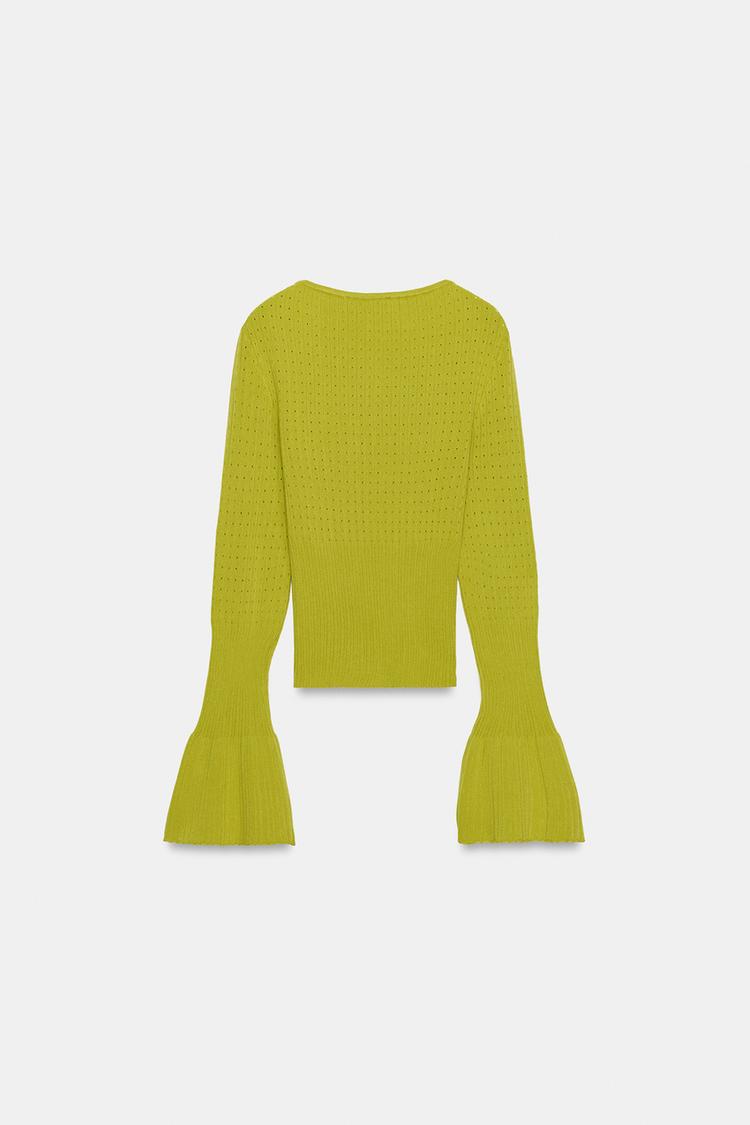 ZARA ДЖЕМПЕР ВЯЗАНЫЙ АЖУРНЫЙ С РУКАВАМИ КЛЕШ, ЗЕЛЕНЫЙ
