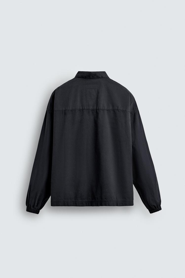 Рубашка свободного кроя из хлопковой ткани. Воротник с лацканами, застежка-молния спереди и длинные рукава с отделкой в рубчик. Нагрудный накладной карман. Эффект потертости.