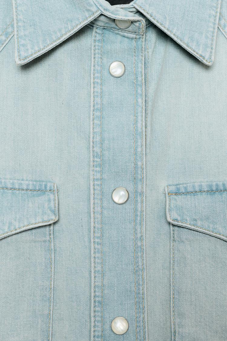 Джинсовая рубашка с воротником и длинными рукавами. Манжеты, накладные карманы с клапанами на груди. Эффект потертости. Закругленный низ. Застегивается на пуговицы.