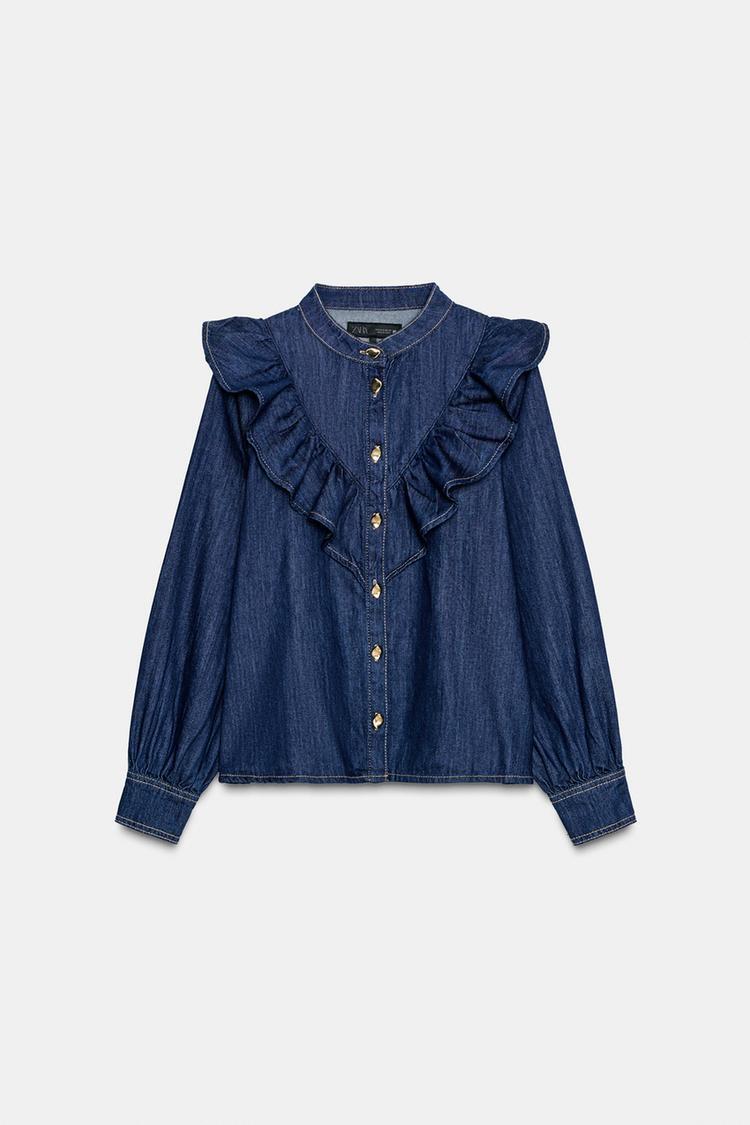 ZARA ДЖИНСОВАЯ РУБАШКА Z1975 С ВОЛАНАМИ, СИНИЙ