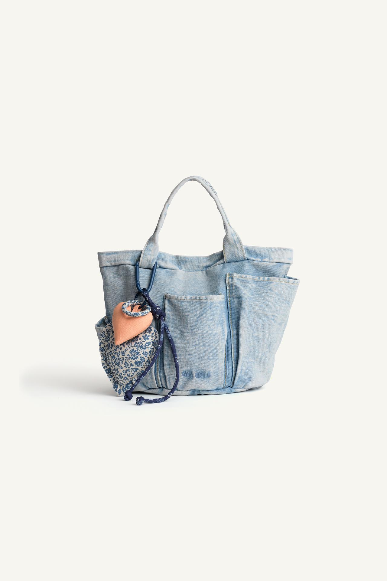 Джинсовая сумка-тоут с деталями в виде сердечек и шнурком. С основным отделением, закрывающимся на магнитную застёжку, и тремя передними карманами. С двумя ручками.