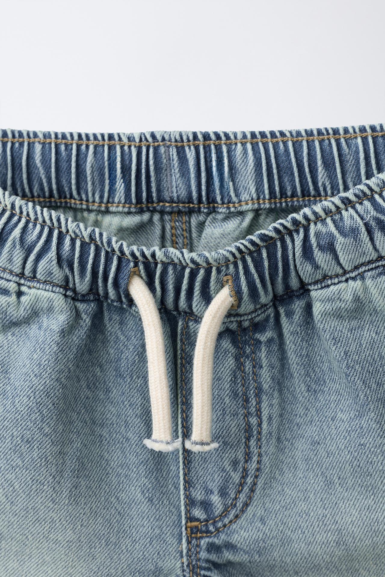 Джинсовые шорты с эластичным поясом и регулируемыми шнурками спереди. Передние карманы и накладные задние карманы с аппликацией-этикеткой.