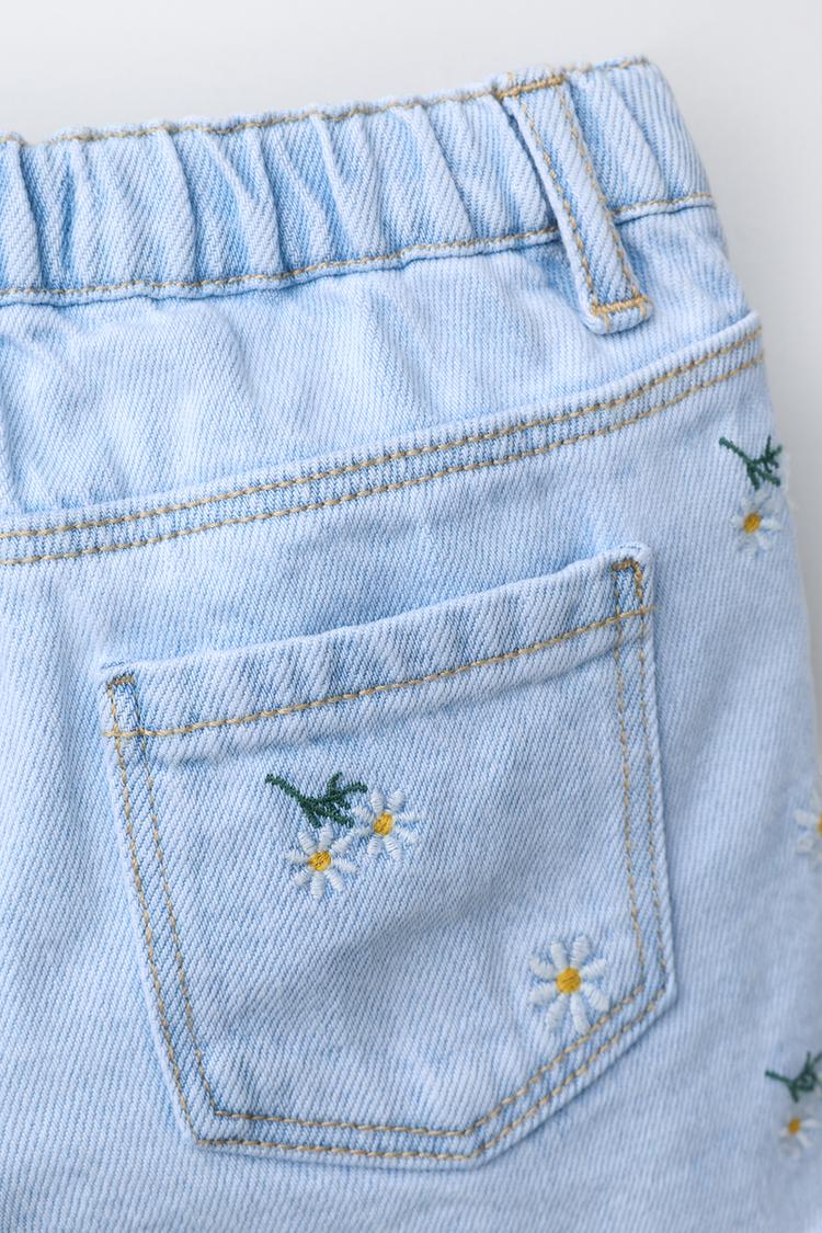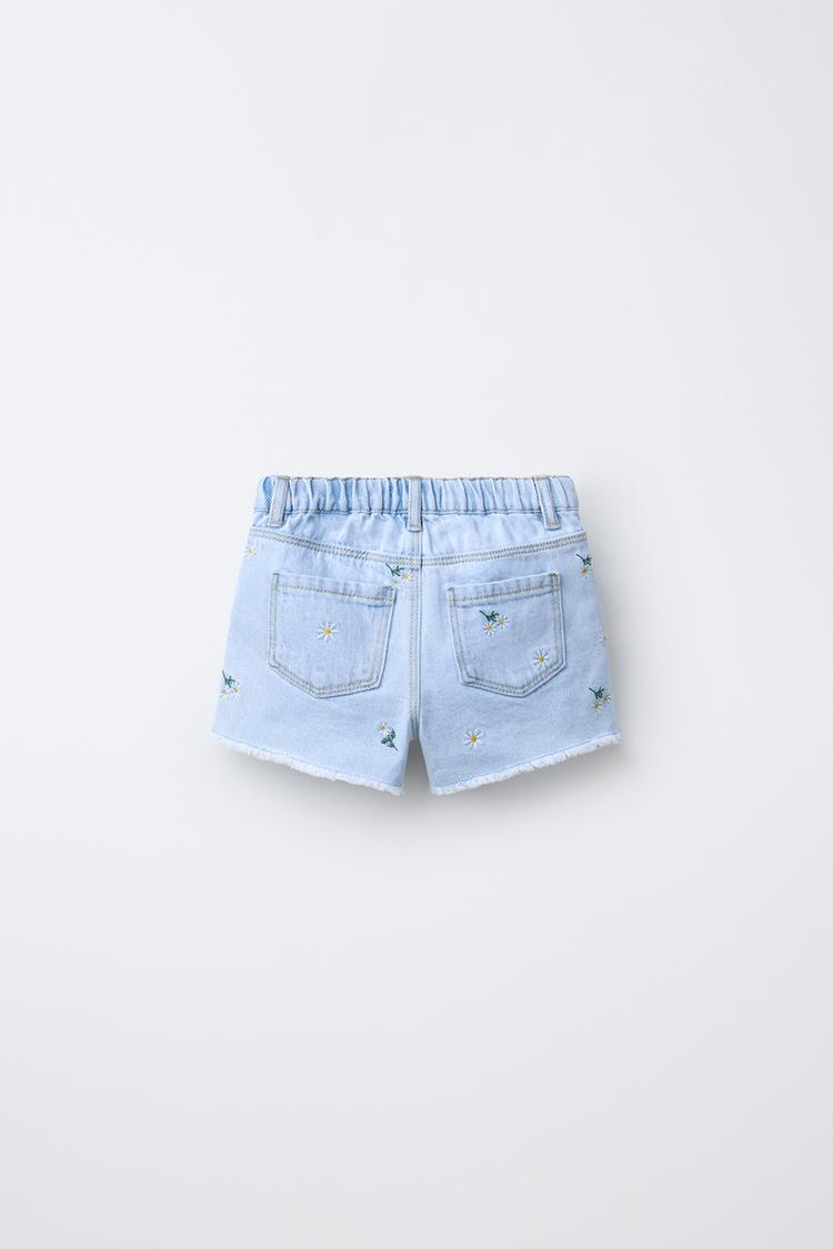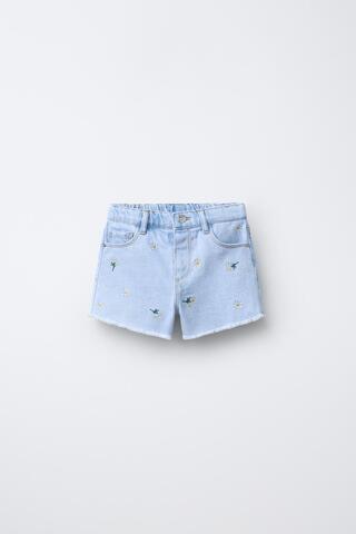 ZARA ДЖИНСОВЫЕ ШОРТЫ С ВЫШИВКОЙ «РОМАШКИ», СИНИЙ