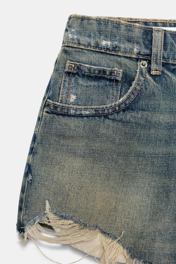 ZARA ДЖИНСОВЫЕ ШОРТЫ TRF С ВЫСОКОЙ ПОСАДКОЙ И РАЗРЫВАМИ, СЕРО-СИНИЙ